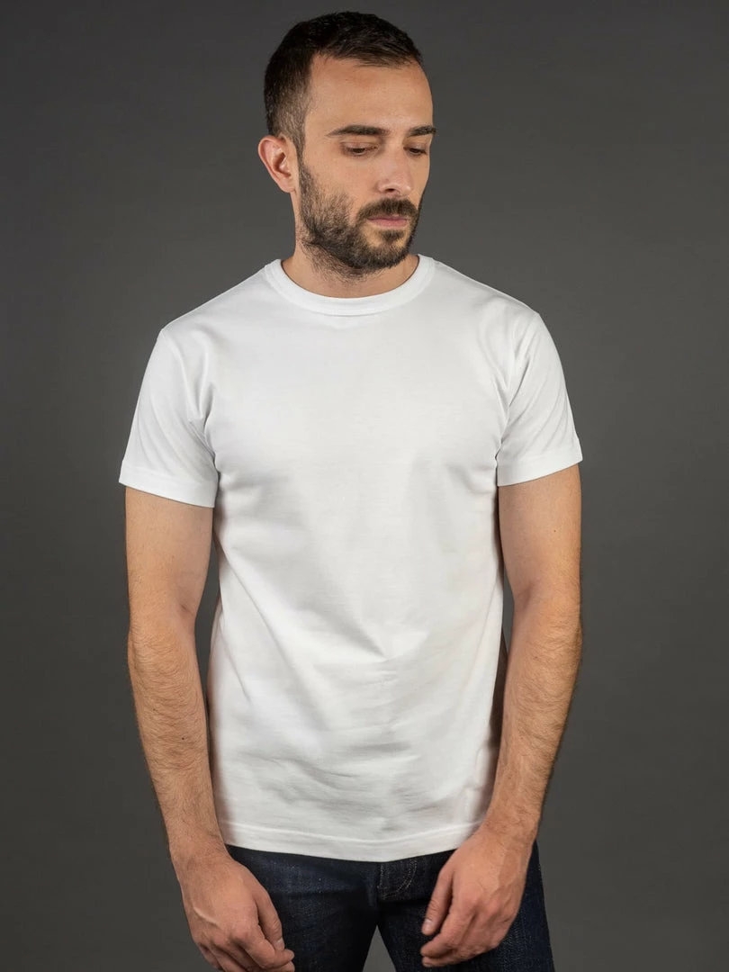 The material is then cut and sewn in San Francisco, CA in the same factory where their jeans are made. The tees have a triple needle coverstitched never-sag collar that stays tight around the neck over extended wears. T-shirts ship in a pack of two.