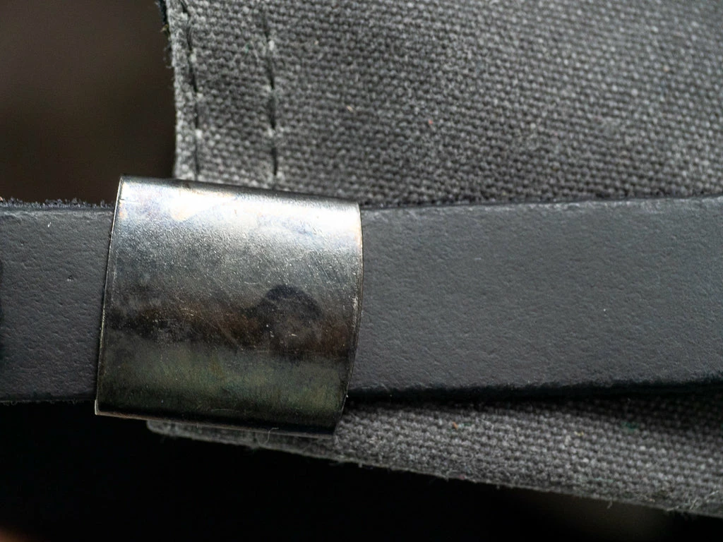 The material is a beefy 10oz waxed canvas that repels water handily in the rain. Made in USA.