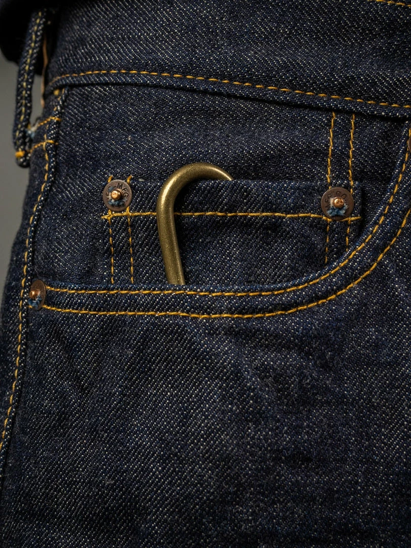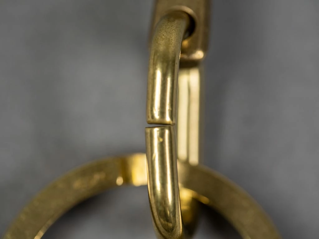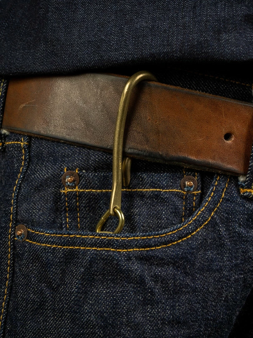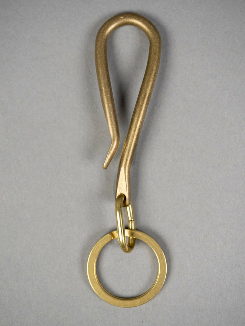 The original solid brass key hook made from the straight brass rod is handmade by a second-generation metal craftsman family. The curved shape fits the body; it is perfect for belt loops, coin pocket or belt. The solid brass double ring is produced by a small metal hardware supplier founded over 80 years ago in Tokyo.