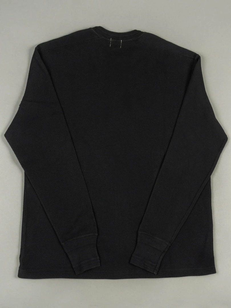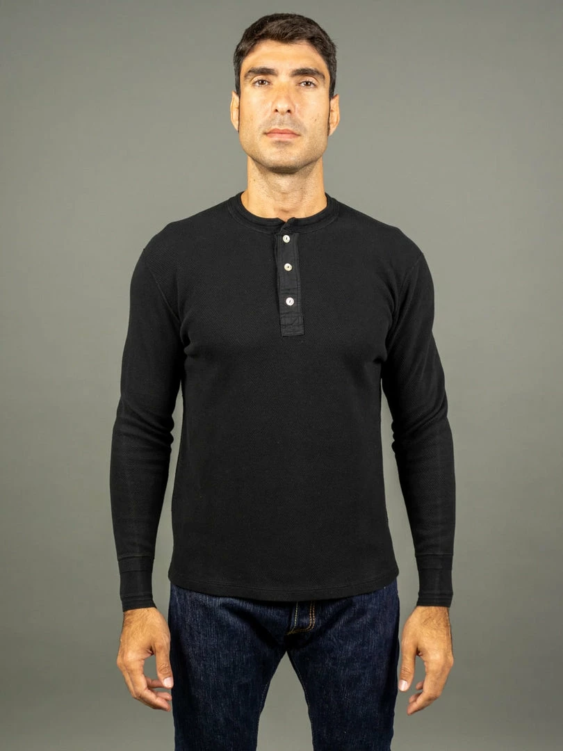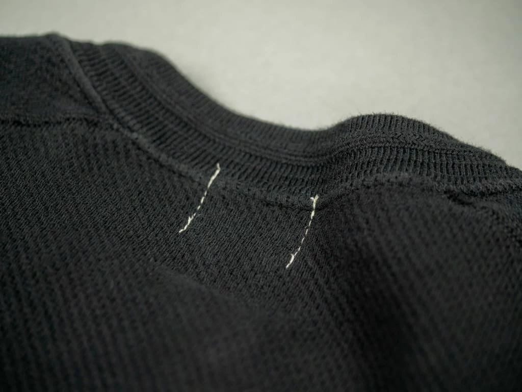 This Fine Aran Honeycomb Henley impresses at first sight for its unique real mother-of-pearl buttons and premium double face honeycomb cotton fabric knitted in Wakayama, Japan.