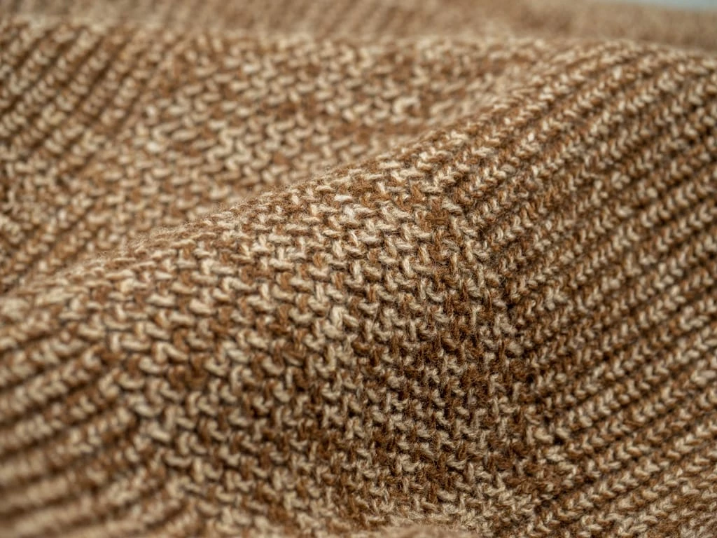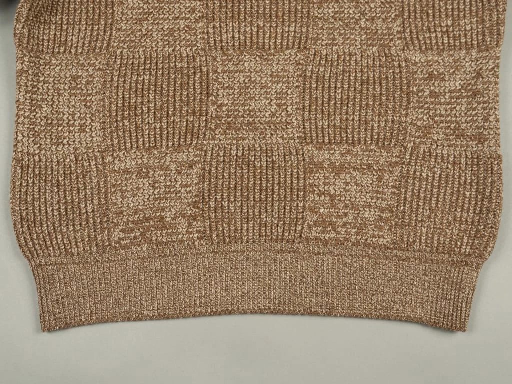 This beautiful piece is warm and comfortable to wear without feeling prickly. The fabric allows you to experience the original texture of wool. Switching the knitting next to each other in a square shape is a complex pattern switching that has become a very rare knitting structure.