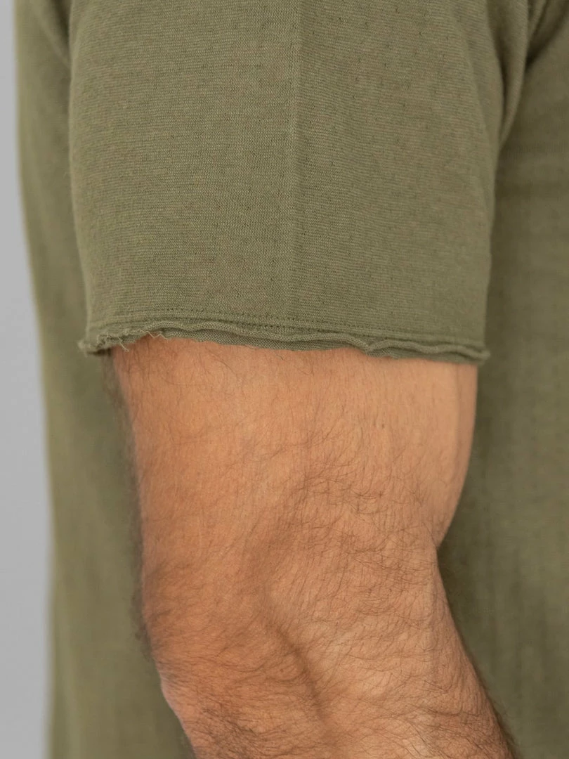 This low wedge crew neck tee features a special cut-off detail that gives it more of a worn-in vibe. The dual-layer fabric is made from a thicker-than-usual SZ (nº40) grafted yarn (yarn with a double twist in both directions to suppress skewing) and is knitted to a good thickness and fluffiness, resulting in a soft and silky knit.