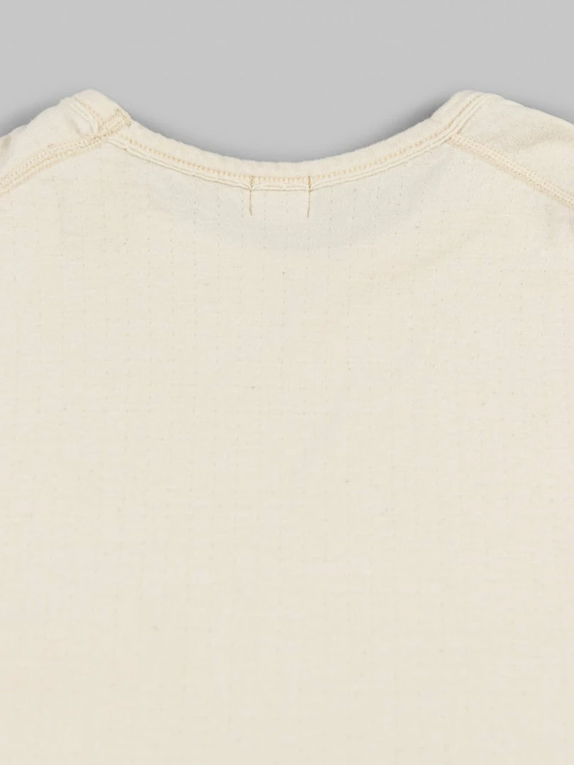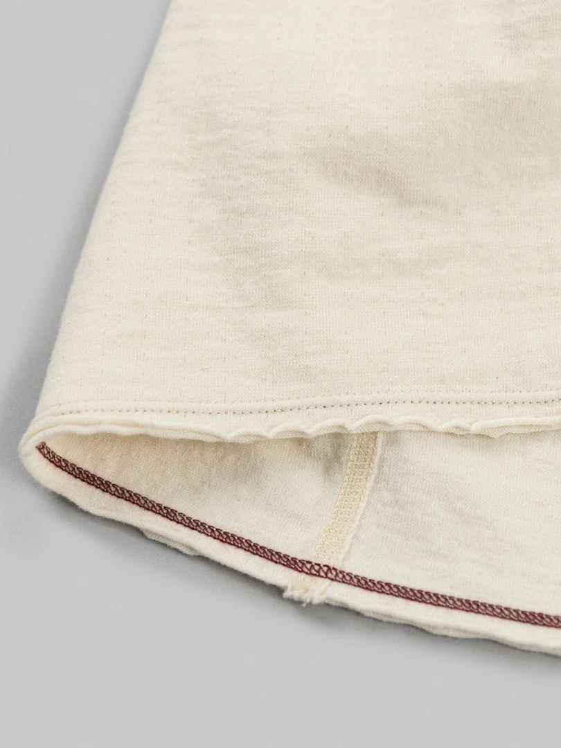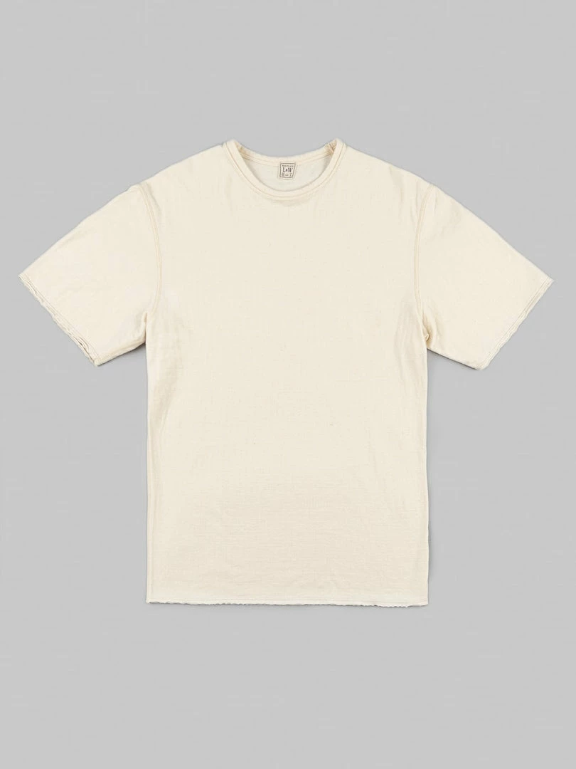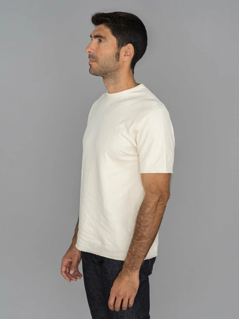This low wedge crew neck tee features a special cut-off detail that gives it more of a worn-in vibe. The dual-layer fabric is made from a thicker-than-usual SZ (nº40) grafted yarn (yarn with a double twist in both directions to suppress skewing) and is knitted to a good thickness and fluffiness, resulting in a soft and silky knit.