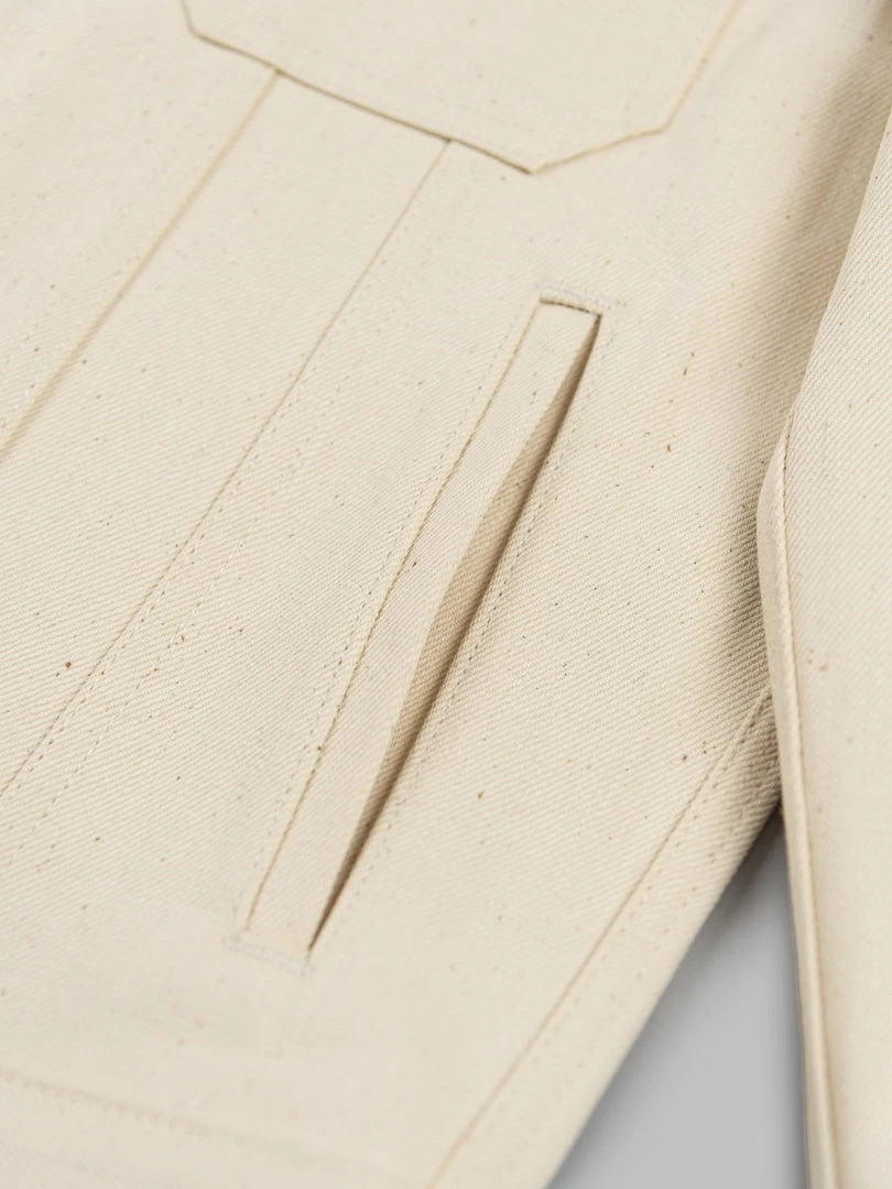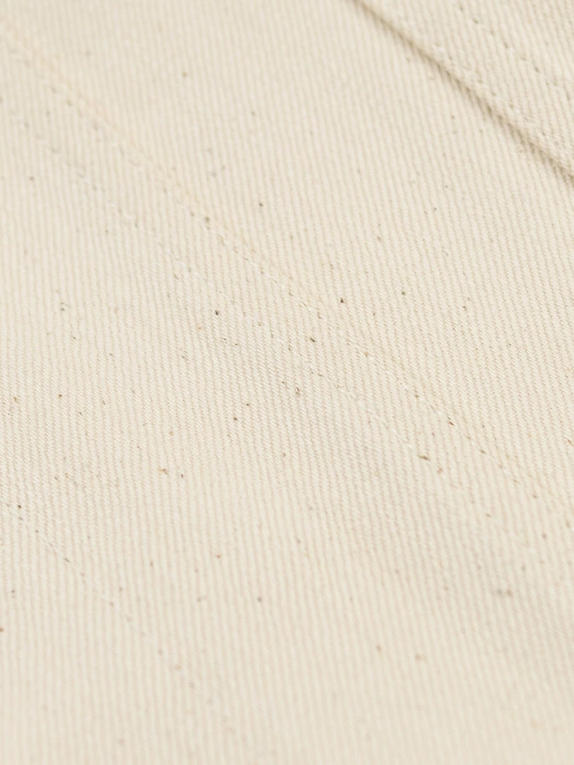 - 14oz sanforized Ecru Japanese selvedge denim from Nihon Menpu. It is sanforized, so expect no shrinkage