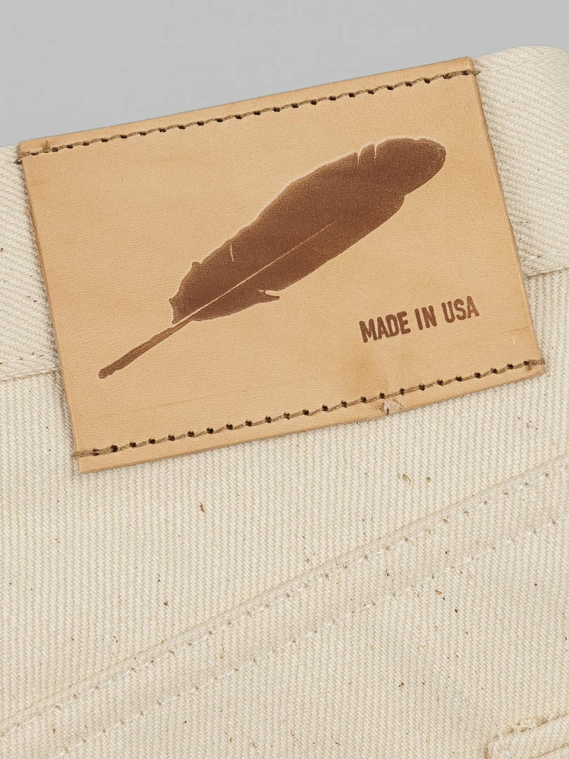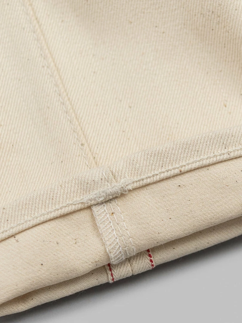 - 14oz sanforized Ecru Japanese selvedge denim from Nihon Menpu. It is sanforized, so expect no shrinkage