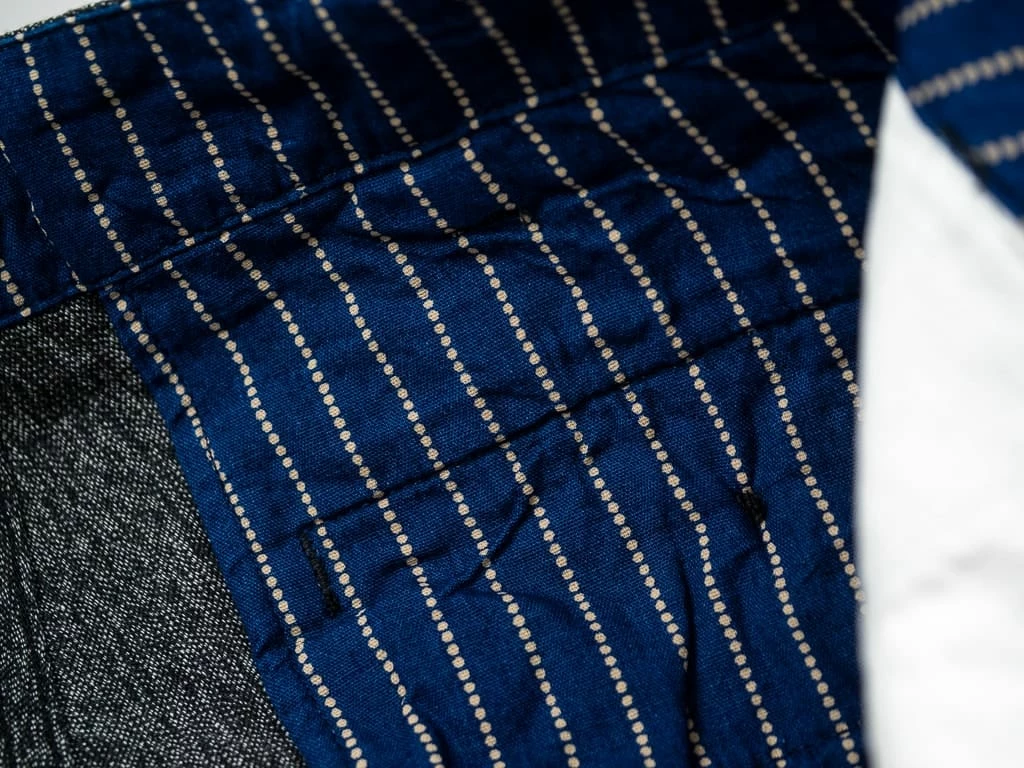 - Indigo discharge-dyed Japanese-milled 5 oz. chambray Wabash waistband, back pocket bags, and fly piping