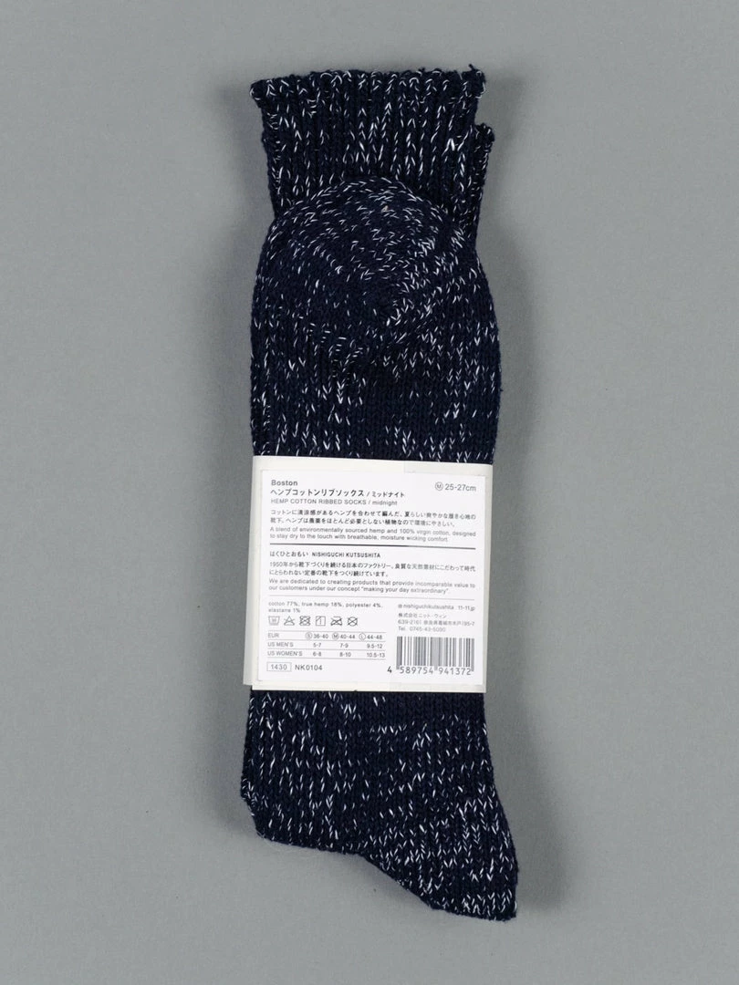 Nishiguchi has combined hemp to add a crisp and cooling effect to the cotton. These socks are ideal for hot summer days as they feel dry to the touch and are of lasting comfort. Hemp is a plant which requires almost no pesticide — environmentally friendly indeed.
