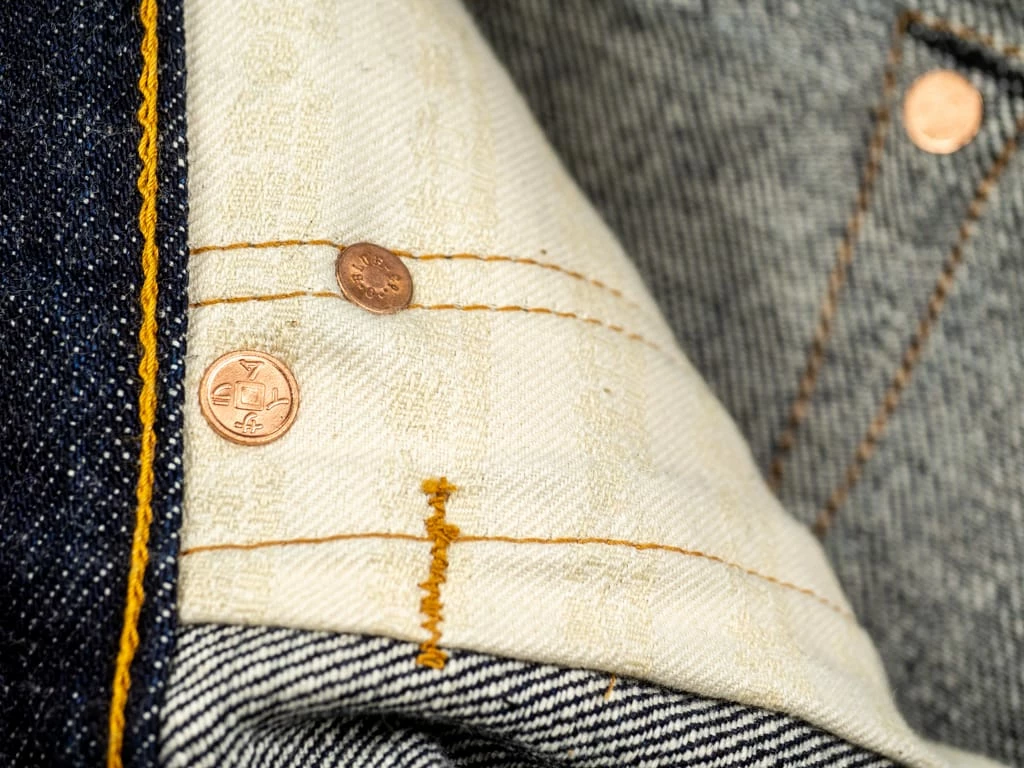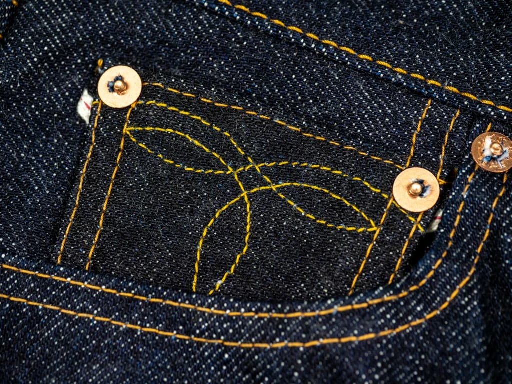 The most prominent detail on the denim is the back pocket, one of the key pieces in the collab denim. On one hand, the shape of the back pocket does not take the usual form of Samurai jean pockets, nor does the arc. For the arc they took inspiration in Samurai’s Yamato arc and incorporated it into Old Blue’s own arc: the “Double Looped” arc with the double-row stitching type. The result is simply wonderful, with both brands featured in the back pocket.