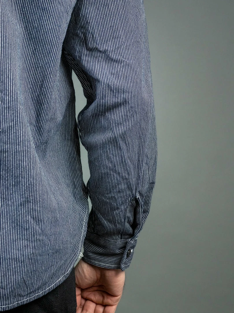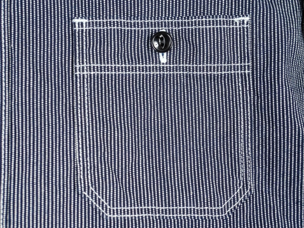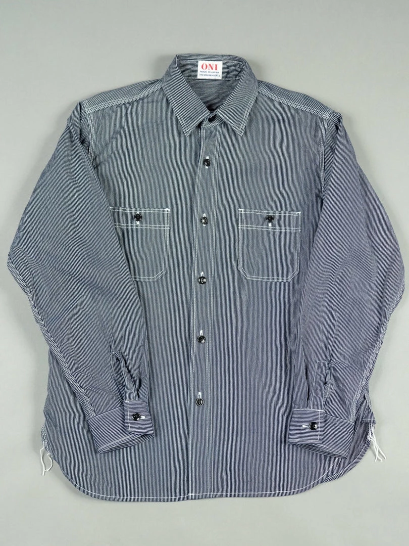 This is the first time that ONI has produced a Hickory workshirt. This beautiful piece is based on the classic Hickory fabric popularized by American railway workers at the turn of the century. The indigo and white hickory stripe is an instantly recognizable fabric, both iconic and vintage.