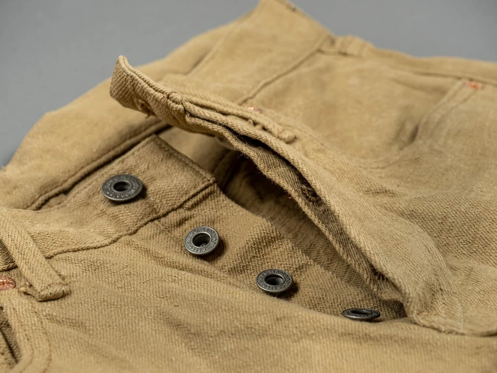 The fabric is a 12oz beige denim made of American and Peruvian cotton blend. Oni invested a lot of time experimenting in a highly technical production by setting the density of the weft yarn higher than the concentration of the warp yarn. The result is a super low tension denim that keeps the slubby texture and maximizes breathability.