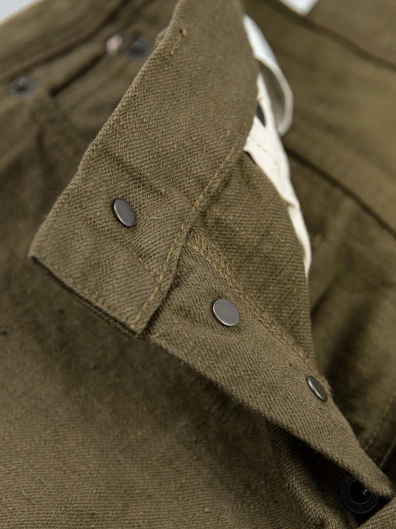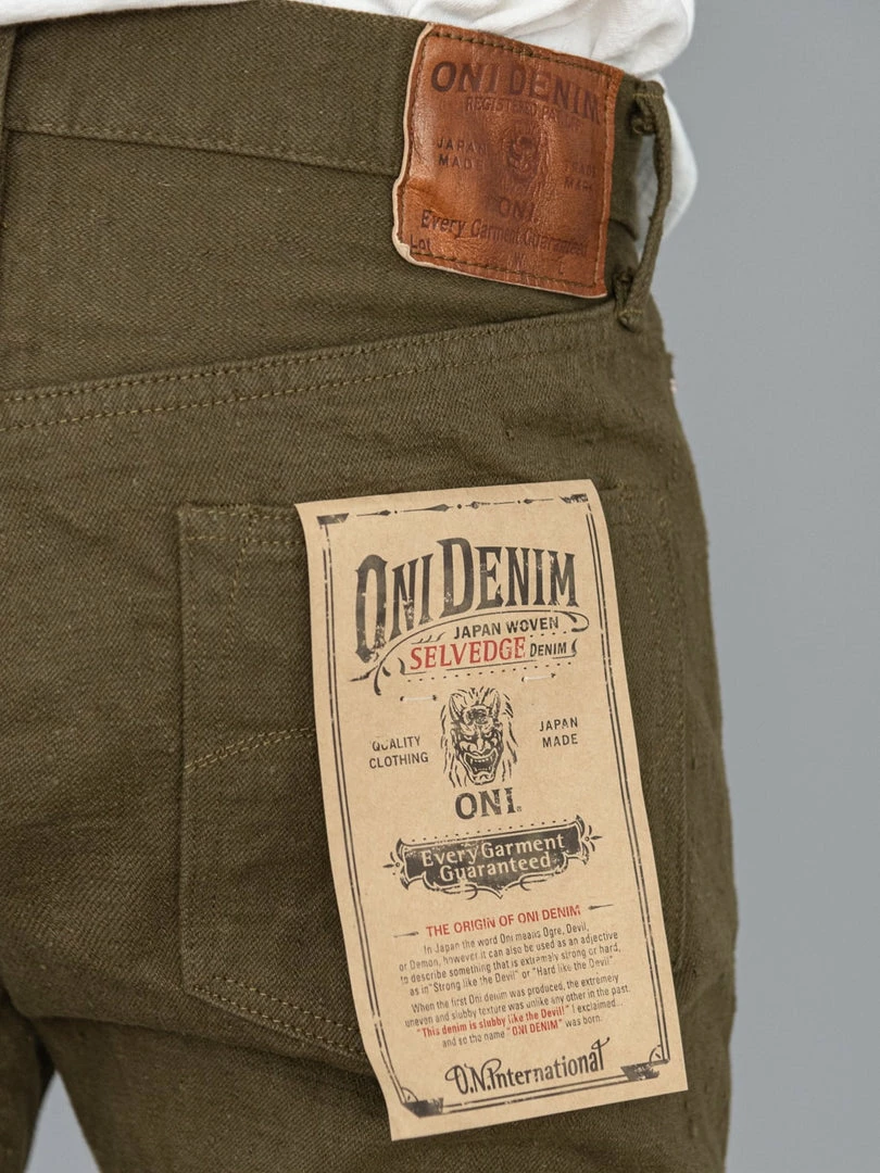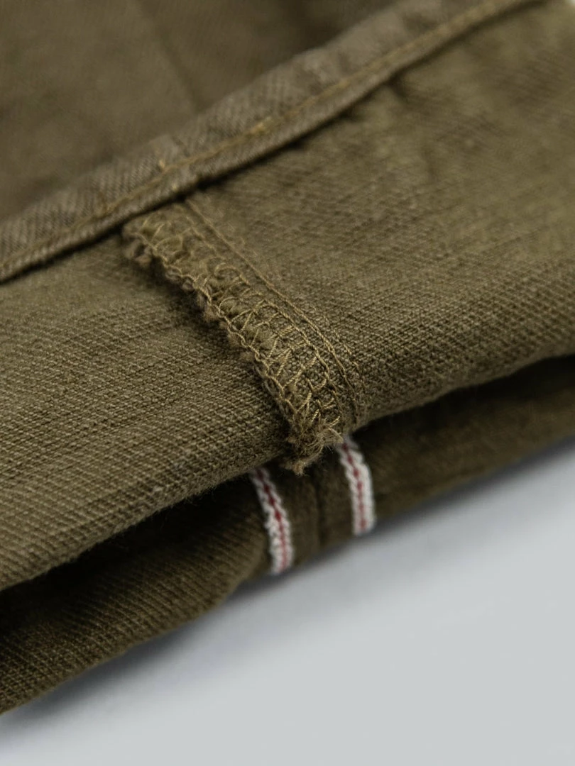 The fabric is a 12oz olive dyed-thread (both warp and weft) denim made of American and Peruvian cotton blend. Oni invested a lot of time experimenting with super low tension denim with an extremely uneven texture and high breathability. We have never seen a crazy slubby texture in a 12oz denim before.