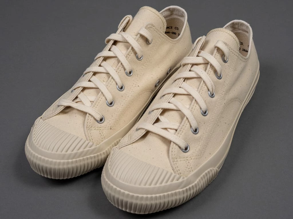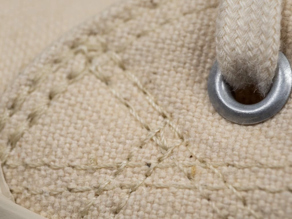 The 100% Hanpu cotton canvas upper is carefully woven in Kojima, using an old Toyoda GL9 shuttle loom.