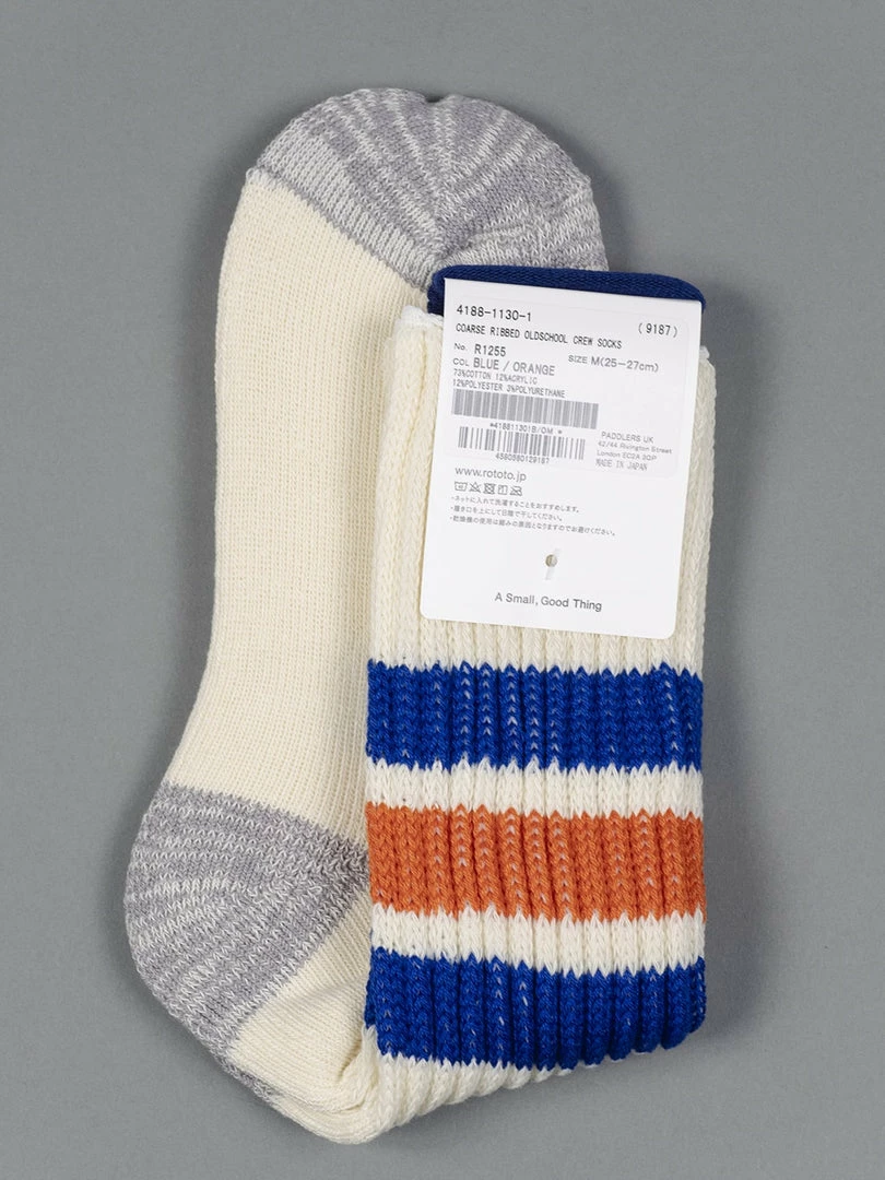 Designed based on tube socks made in the U.S. in the late 1970s, these ribbed socks are knitted with a special knitting machine that is hard to find today, using low-count supple cotton yarn. The liner of the sole is brushed for a unique bouncy feel that only Rototo can create. The simple design fits any outfit, from skater-like sporty styles to traditional ones.