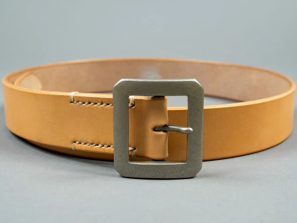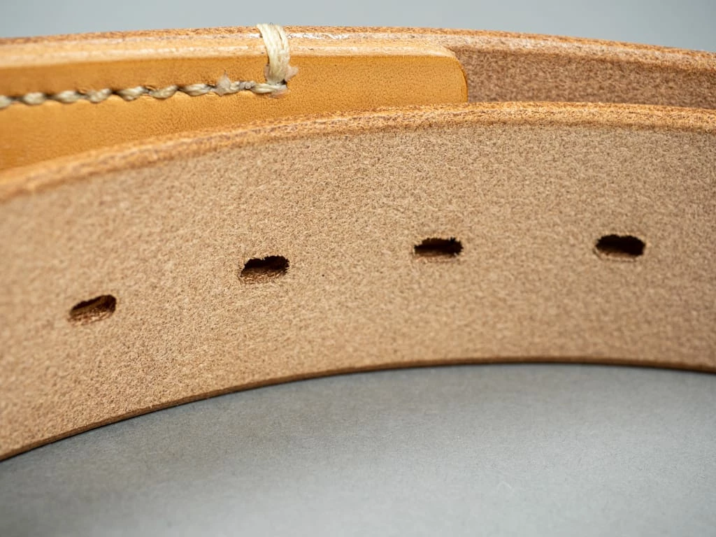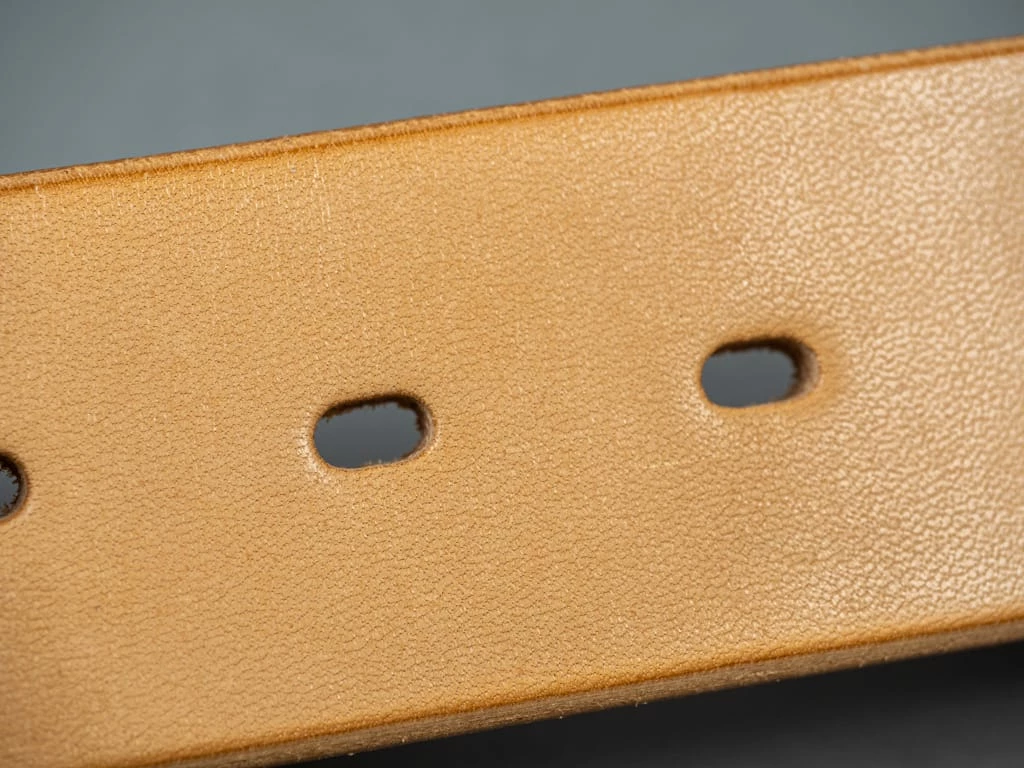 This is a Tochigi premium leather belt in natural colour with a solid brass Garrison buckle. It has been cut and defined by hand by a master leather craftsman in Japan. The leather comes from Tochigi, one of the world’s few tanners that continues to use only natural vegetable tanning and has been cut from bend, the thickest and firmest part of cowhide. It provides superior strength, firmness and durability.