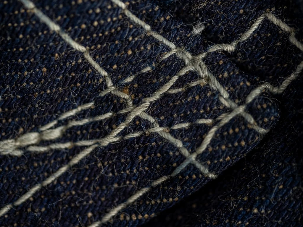 The warp has been naturally dyed with the “Kasezome” method (Hank Dyeing). It is a very unique and time-consuming hand dyeing process in which colour penetration is maximized, and the yarns retain their original texture. First, the skein of yarn is wrapped and washed in water, opening the fibres to receive the dye. It is then dipped into an indigo vat for up to forty-eight hours, rinsed, and redipped. This procedure is repeated several times. Once the desired colour is achieved, the yarn is steamed to fix the dye to the fibres. Because it does not use as many chemicals as other forms of dyeing, Kasezome is less damaging to the material. The final indigo colour is also usually more vibrant than those achieved by other dyeing methods.