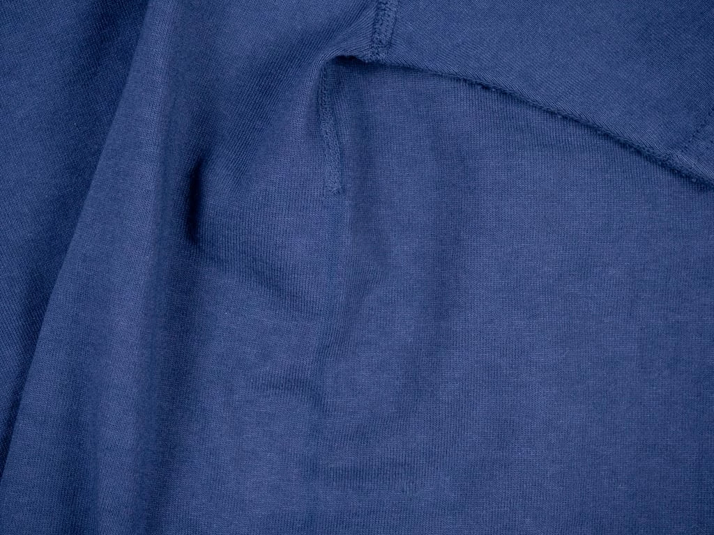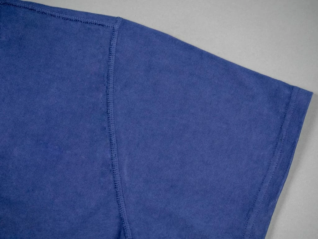 This Studio D’artisan Loopwheeled (“Turi-Ami”) t-shirt is woven in the Japanese Kanekichi Wakayama workshop, one of only two workshops in the world still keeping in operation after more than 100 years the tubular textile production machines that allow seamless garments to be made. The only tension used in the knitting process is gravity, the end result being a knitted fabric with virtually no inbuilt stress or tension. A loopwheel machine rotates at just 24 revolutions per minute, a modern knitting machine in excess of 10 times that. The result is a very soft but strong fabric, and the best tee material made today.