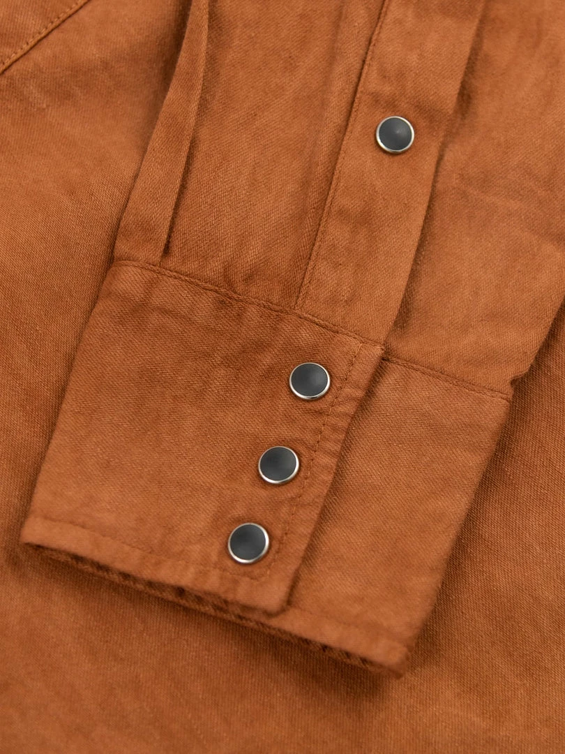 This shirt features a distinctive design with western front and back yokes and snap buttons.