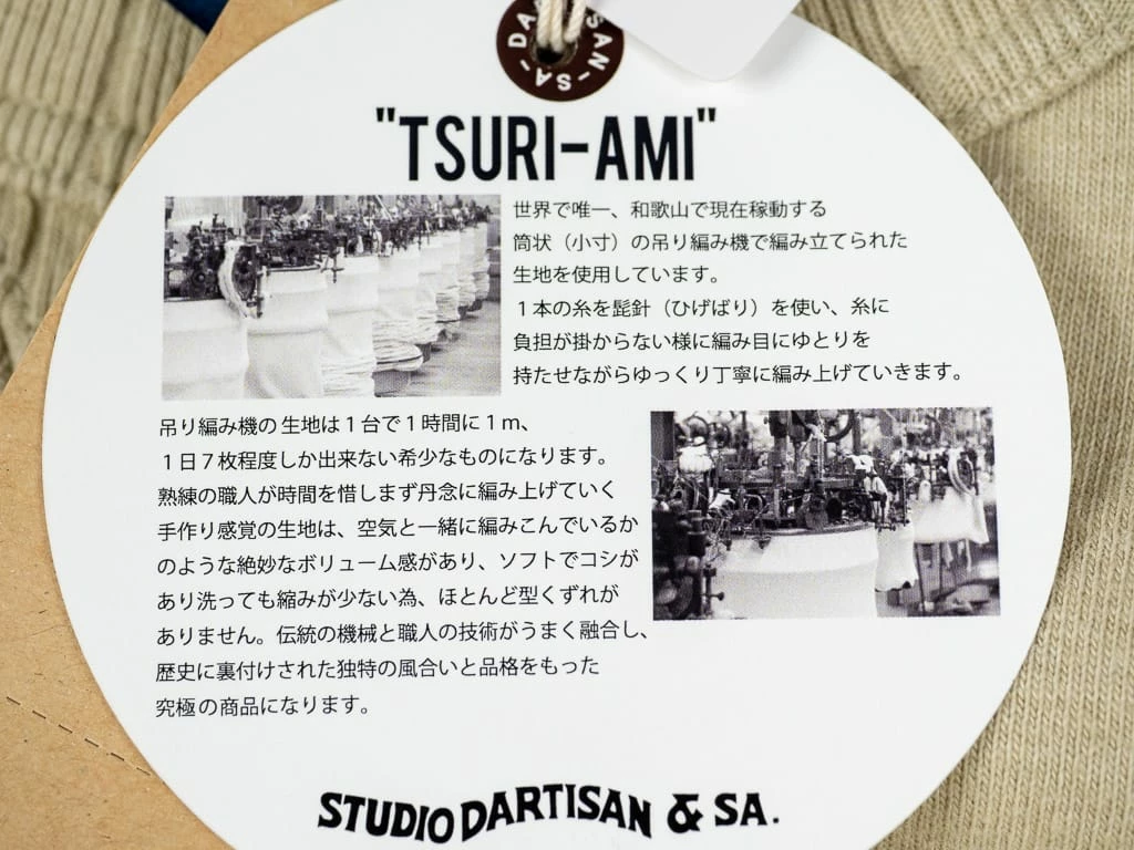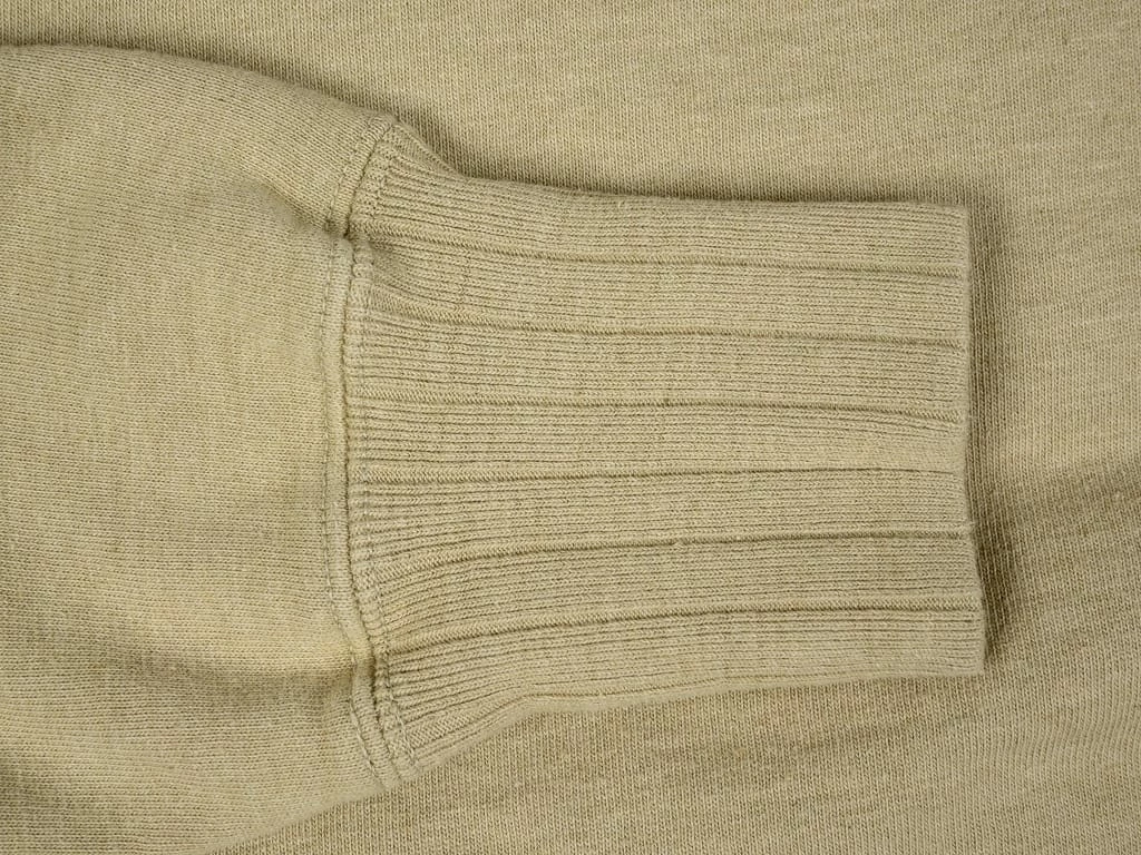 This Studio D’Artisan Loopwheeled (“Tsuri-Ami”) sweatshirt is woven in the Japanese Kanekichi Wakayama workshop, one of only two workshops in the world still keeping in operation after more than 100 years the tubular textile production machines that allow seamless garments to be made. The only tension used in the knitting process is gravity; the end result being a knitted fabric with virtually no inbuilt stress or tension. A loopwheel machine rotates at just 24 revolutions per minute, with only 8-10 garments worth of fabric produced per day. A modern knitting machine in excess of 10 times that. The result is a very soft but strong fabric, and the best sweatshirt material made today.