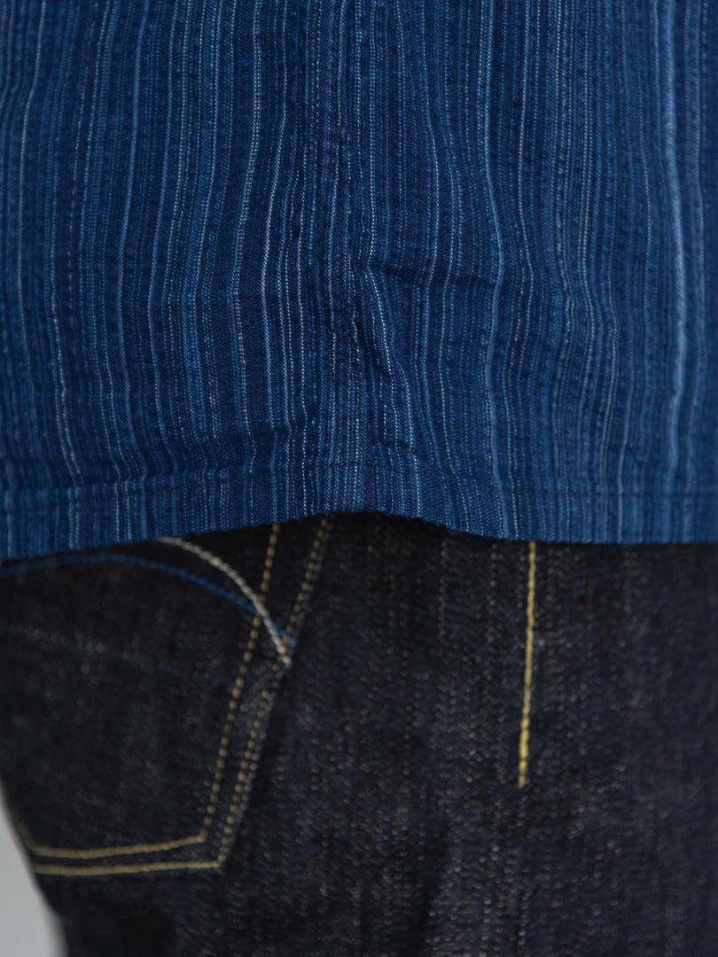 This beauty is made of midweight Japanese Shijira weaving indigo dobby fabric with a Kasuri striped pattern, which gives the shirt a unique unevenness called “shibo”, created by the difference in elasticity between the number and combination of warp and weft yarns and an ultra-loose weave. The texture makes it pleasant to the touch, light, breathable and easy to wear. Shijira fabrics were used during the Meiji era as a fabric for summer Kimonos.