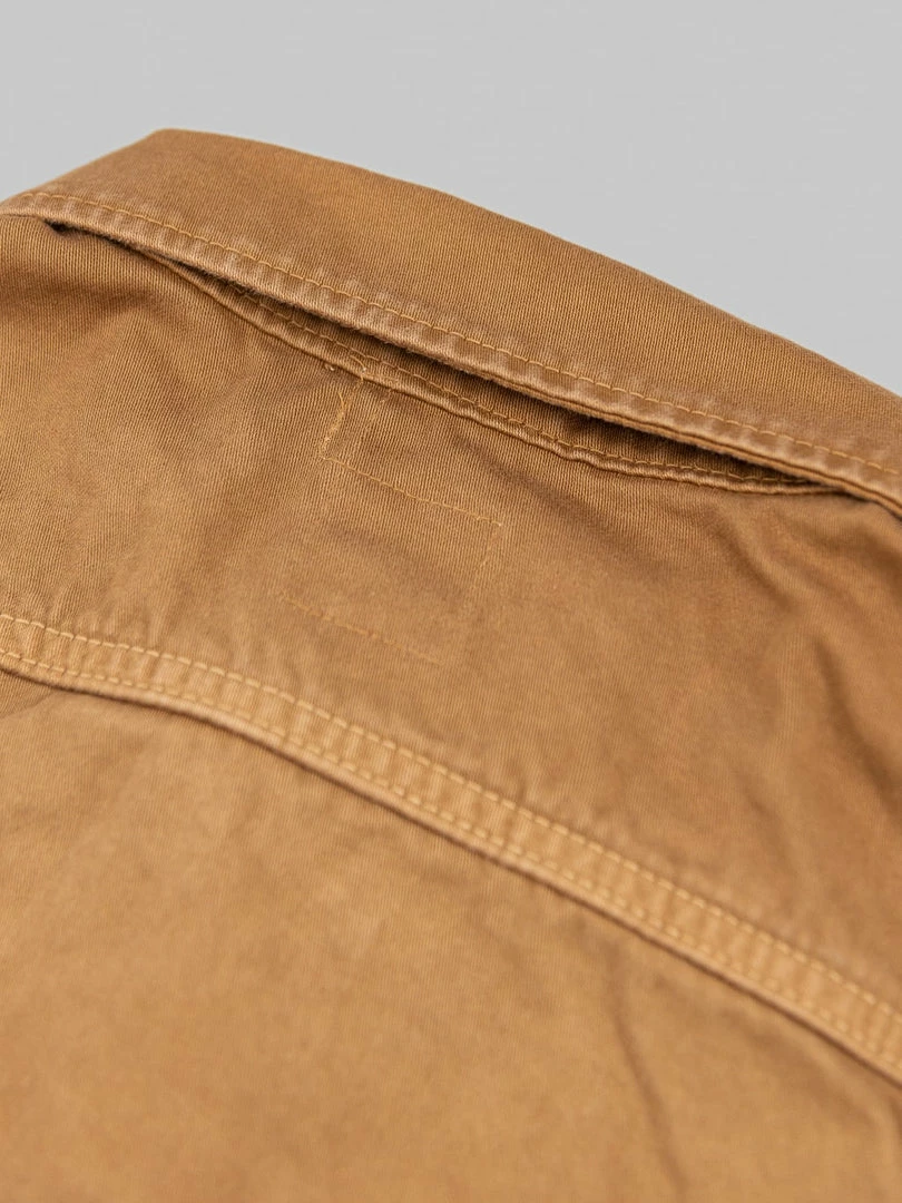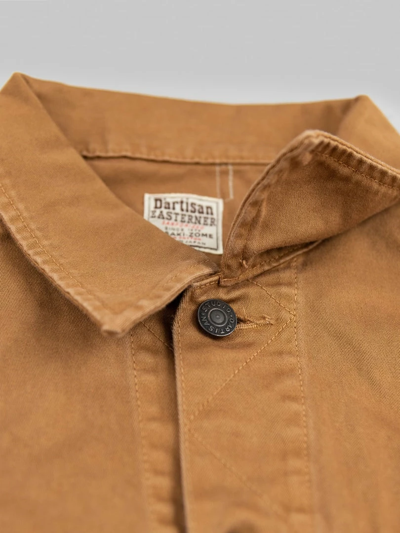 This lightweight jacket is one of the main pieces of this new Kusaki zome SS22 collection. It has been garment dyed with Kakishibu, an all-natural dye from the Heian period -more than 900 years ago- fermented from the juice of unripe persimmons to create the natural khaki coloured dye.