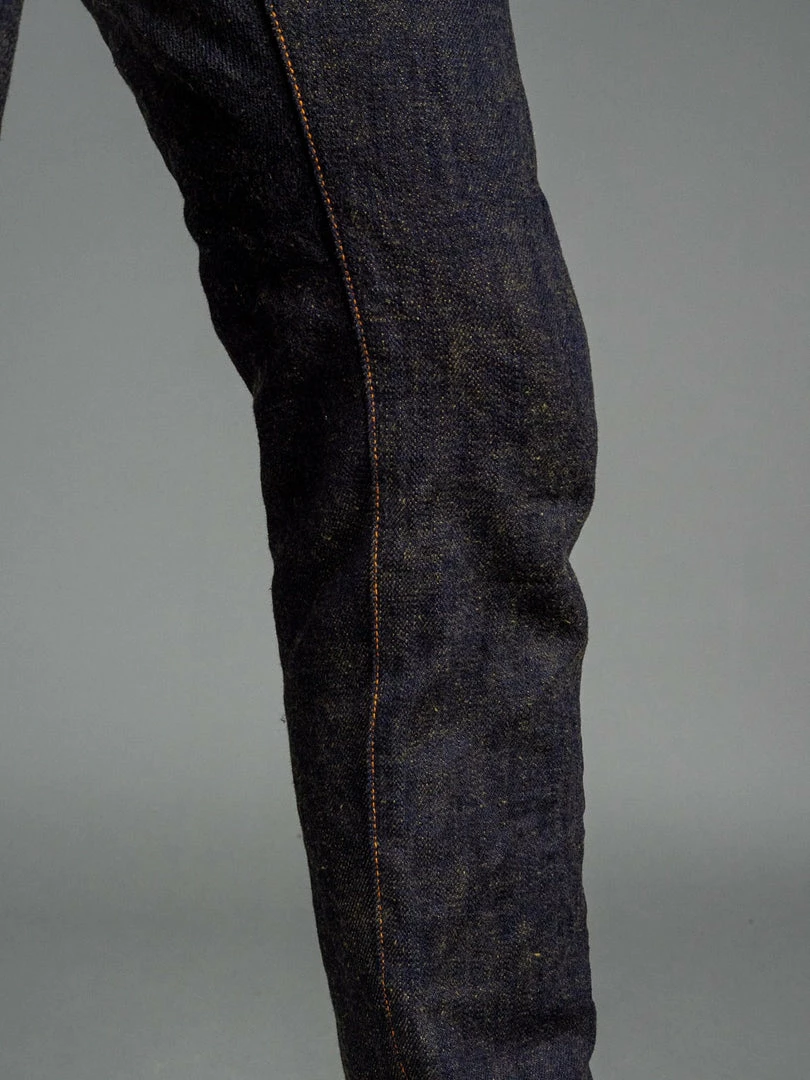 The Kusaki fabric gets its name from a very traditional Japanese dyeing technique: Kusakizome. Given the labour-intensive process of dyeing the yarns in a natural dye like Kusakizome, only a small production lot of these jeans can be made. The vegetable dyes used come from the skin of the pomegranate grown south of Japan’s main island, along with some iron to achieve that extra-light shade of green. The warp threads are surface-dyed with indigo in a rope dyeing machine. The threads are dipped into pure indigo seven times to get a deep shade of blue that will nonetheless bleed indigo quickly. This fabric is engineered for quick fades, and you will see results after a really short time.