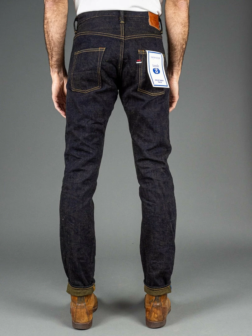 The jeans are made with all the superior-quality Tanuki details such as copper hardware, Tanuki logo embroidered back pocket detail, and the iconic Tanuki custom vegetable-tanned deerskin leather patch. The stitching for this one is quite remarkable: A variety of contrasting bright orange threads which really stand out.