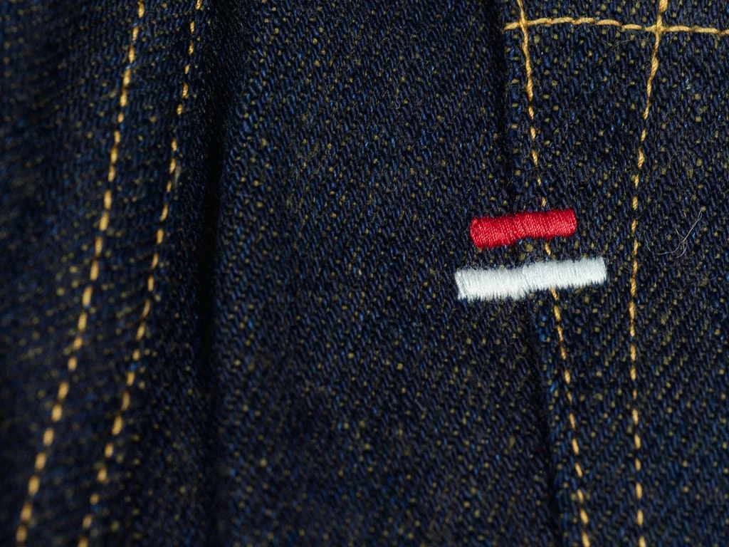 Near the back pocket, there is the embroidered Tanuki 二 (Ni) logo, two parallel lines in Japanese Kanji representing the number 2. The lower line represents the past, tradition, the standard, peace. The upper line represents the future, change, strength. The red and blue colours of their logo refer to Japan’s flag, honouring their roots as denim artisans.