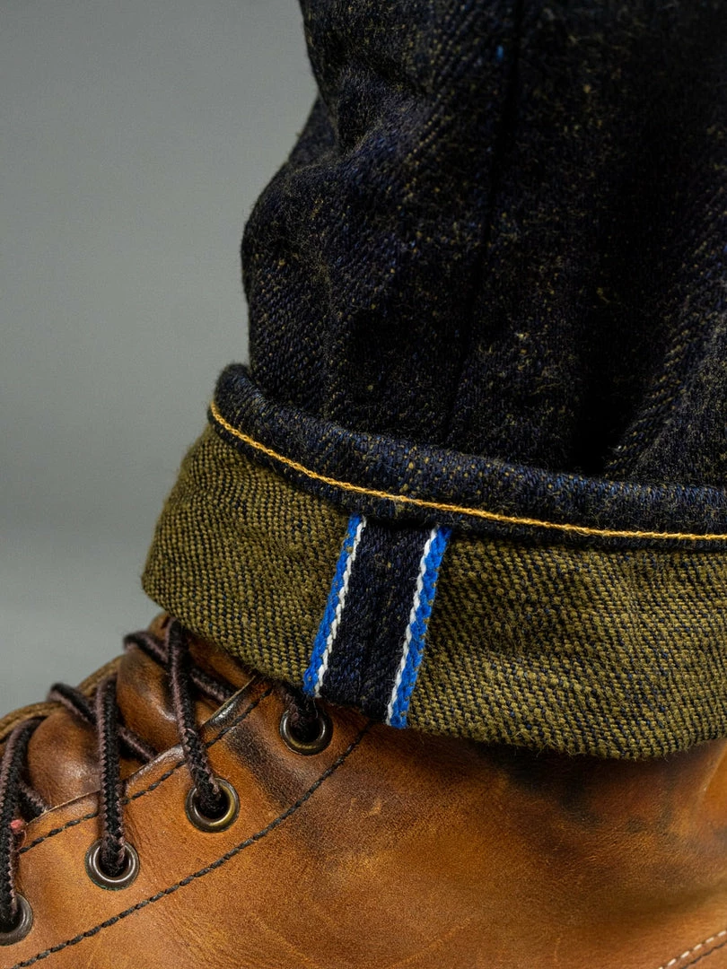 Tanuki did this fabric as a limited 14oz edition in 2020, and they still get loads of requests for it. So the Kusaku fabric is bringing it back on steroids. 19.5oz, very slubby, incredible texture with green and yellow neps, and a very unique fading potential. The weft is naturally dyed with pomegranate rinds and is truly one of a kind. The cotton for both warp and weft is a mix of Texas and Australian cotton for a great compromise of rough and soft.