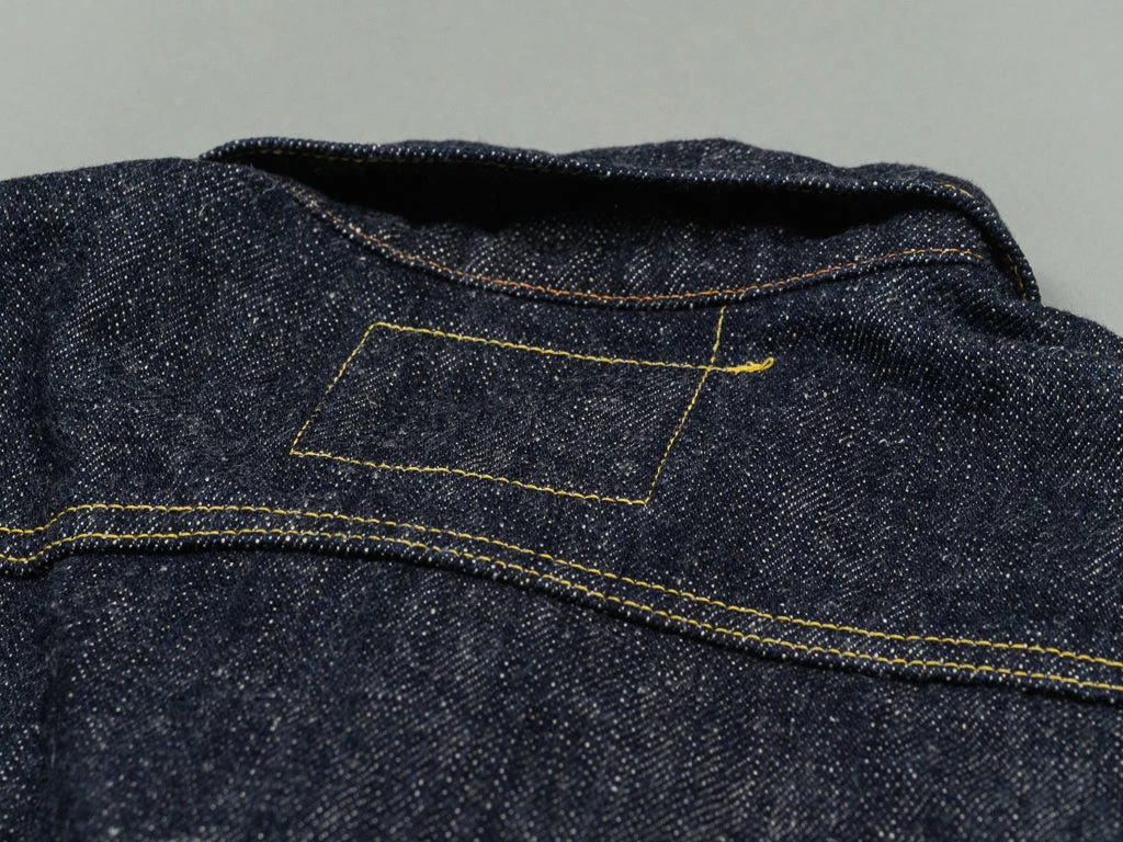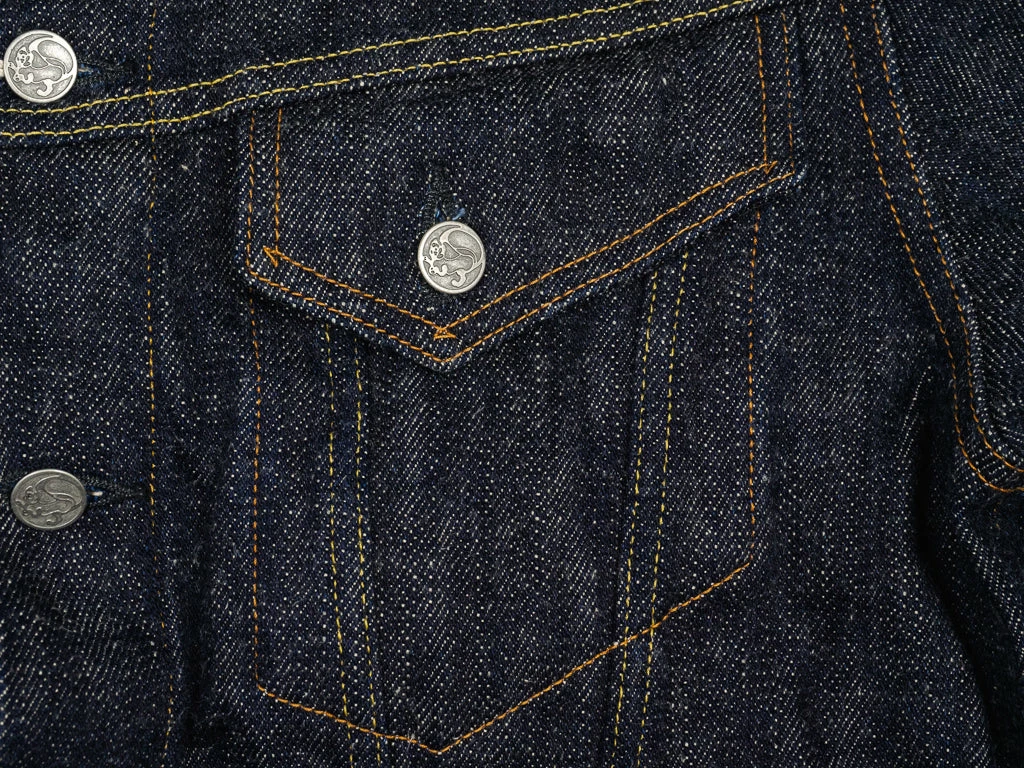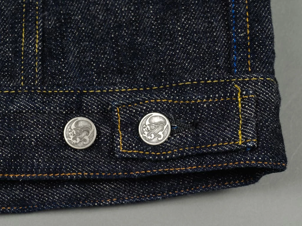 This jacket is made with all the superior-quality Tanuki details such as copper hardware, Tanuki logo embroidered and the iconic Tanuki custom vegetable-tanned deerskin leather patch. The stitching for this one is quite remarkable: look at those bright blue buttonholes!