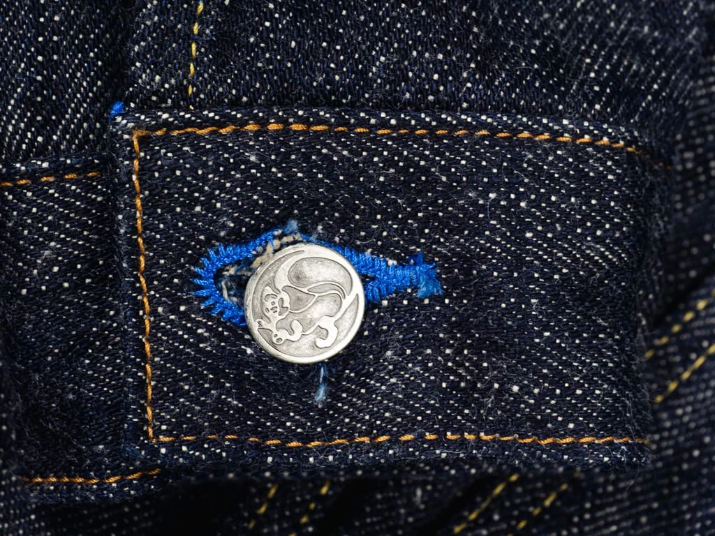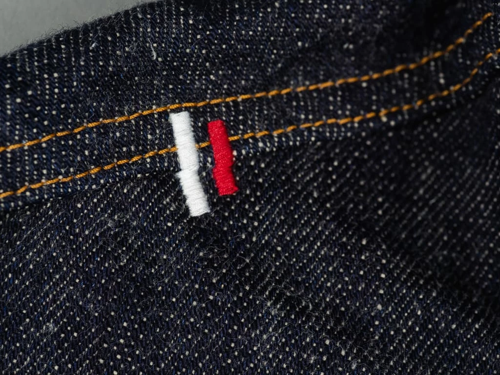 Near the back pocket, there is the embroidered Tanuki 二 (Ni) logo, two parallel lines in Japanese Kanji representing the number 2. The lower line represents the past, tradition, the standard, peace. The upper line represents the future, change, strength. The red and blue colours of their logo refer to Japan’s flag, honouring their roots as denim artisans.