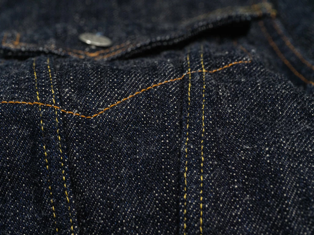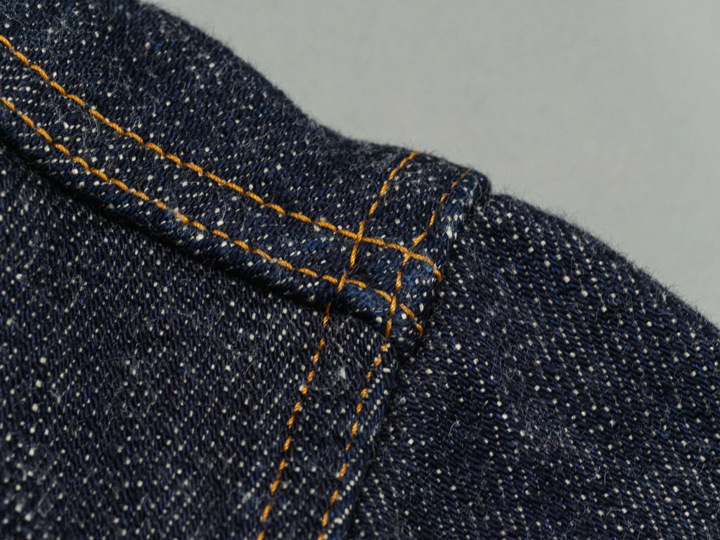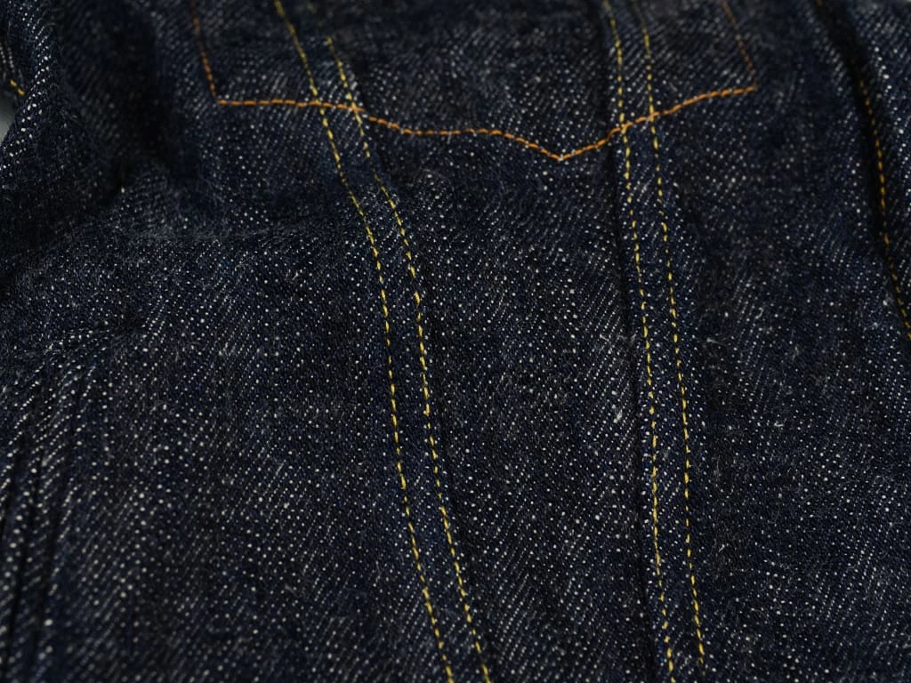 This fabric is special for us because it has been in production for years. The “Miyabi”(é›…) fabric is an updated version of the iconic Tanuki Earth fabric. This fabric clocks in at 18.7oz and packs quite a few features. First of all, Tanuki used unbleached organic Peruvian cotton for the weft, which has an unbeatable feel. Combining that with a warp consisting of Texas and Californian cotton gives a texture that is stiff and crisp, almost like paper, has a lot of fuzziness. Also, there is a lot of slub happening here, allowing some of the off-white weft to peek through the surface. If you look closer, you will see different variations of blue hues. For this fabric, Tanuki used a combination of natural and pure indigo, which will result in some beautiful fades.