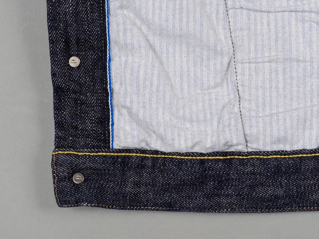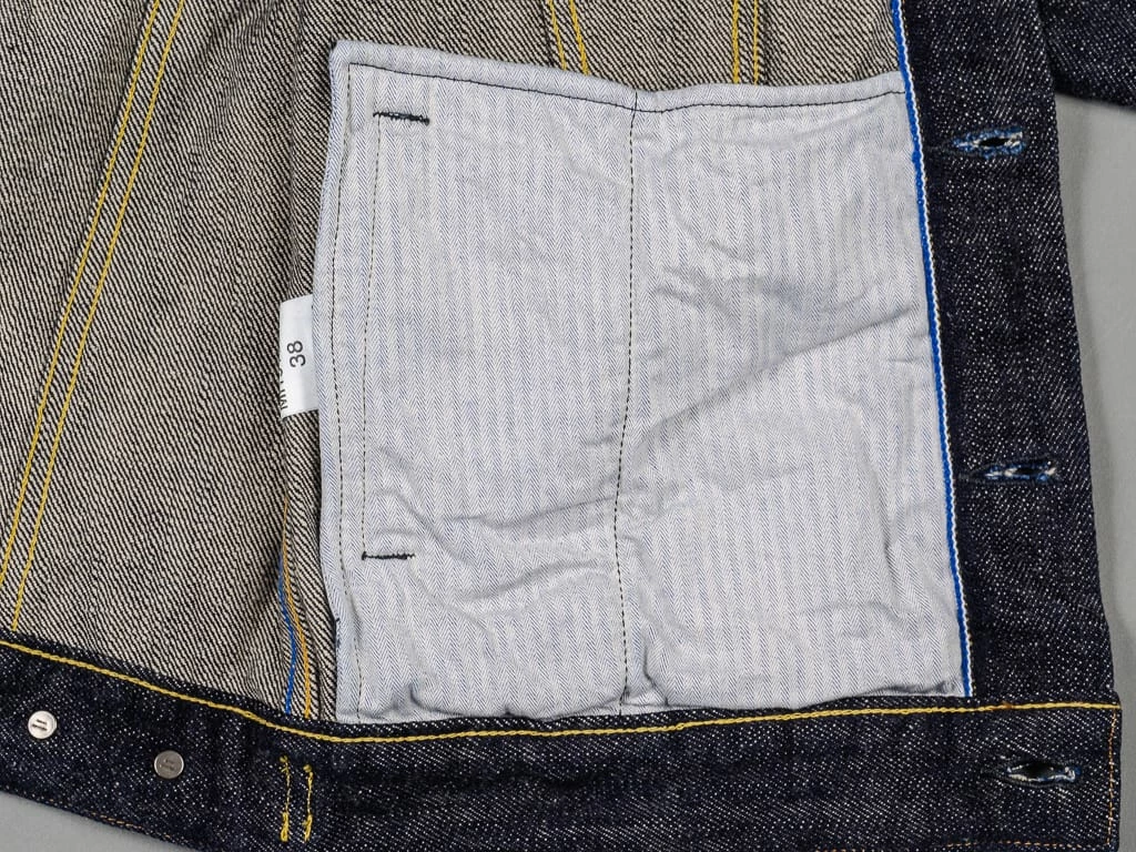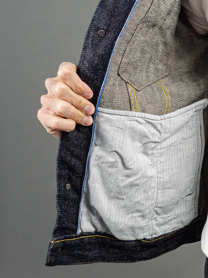 The cut is a modern Type III fit with hand warmer pockets added at the hip, with blue gingham pocket bag lining.