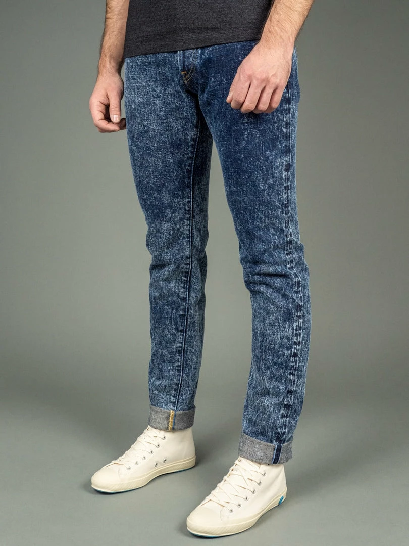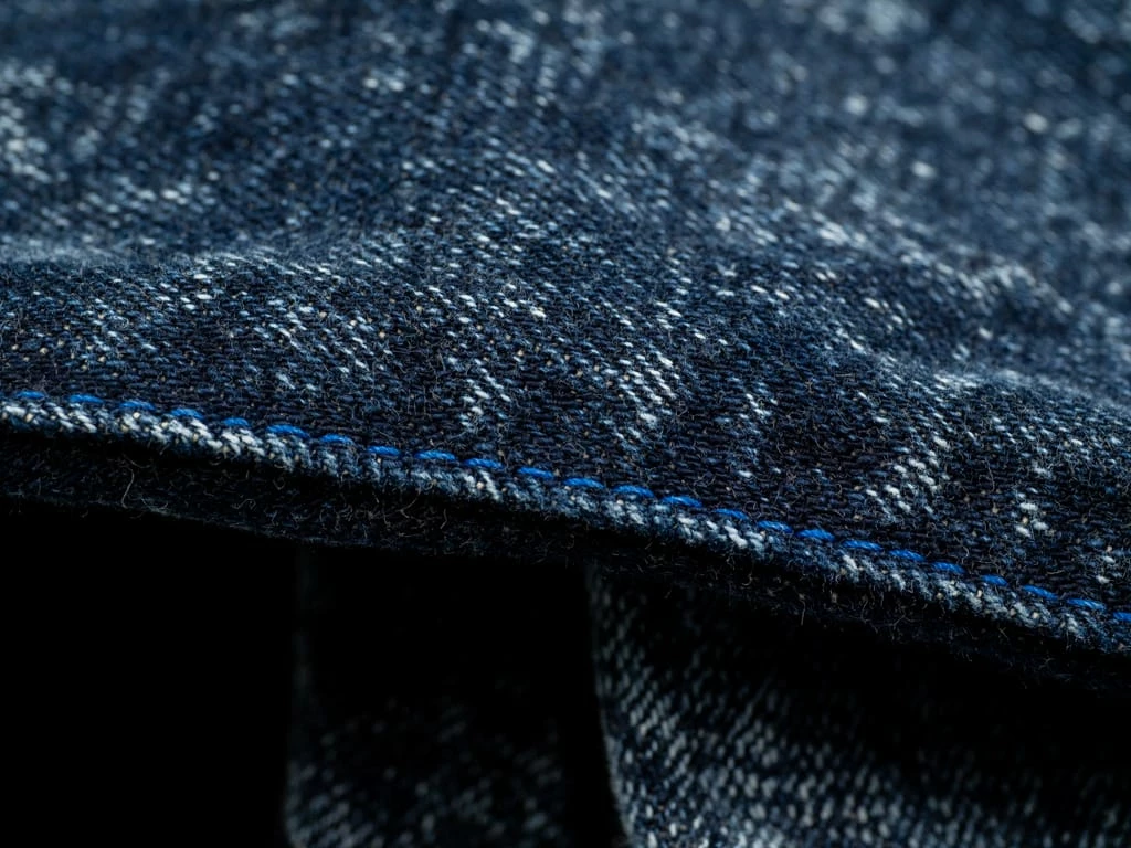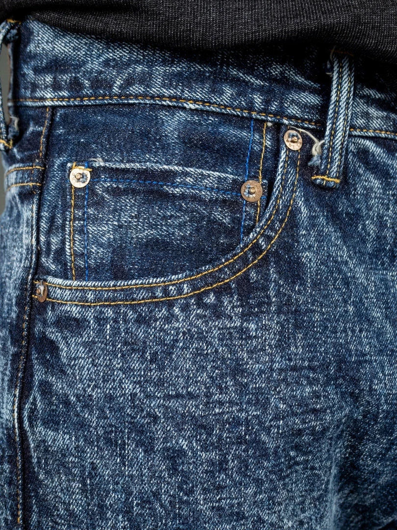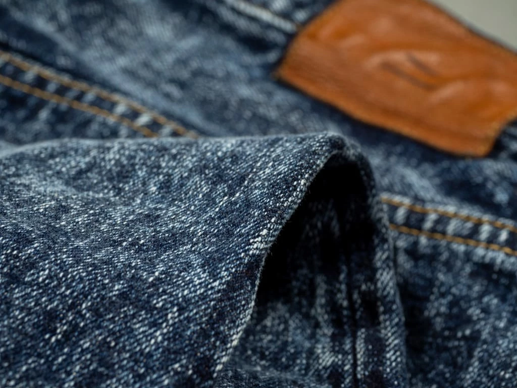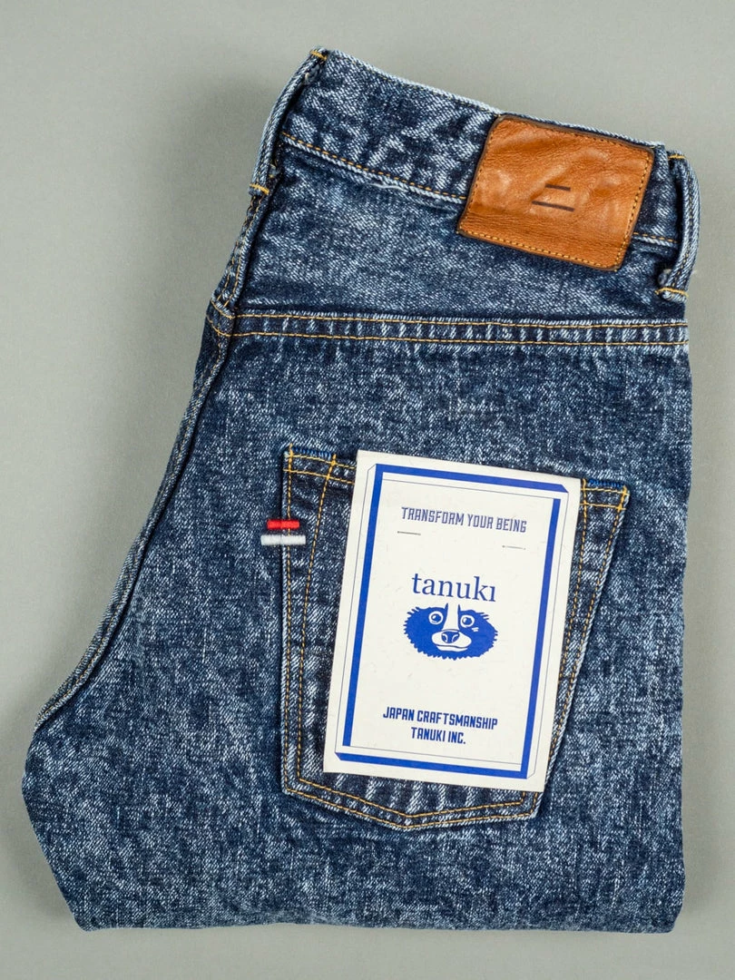 This is Acid Wash, a stunning treatment based on the brand’s popular Natural Indigo fabric. Tanuki opted for their Natural Indigo fabric for this treatment due to its rich and intense shades of blue. In addition, the natural indigo reacts better to the enzyme wash. This fabric allows for great fades and contrasts, making it unique. The fabric has been rope-dyed by the only mill in Japan able to do this type of natural indigo fabric and used special organic natural indigo from India that cannot be found anywhere else in the Japanese denim industry. This fabric is exclusive in many ways. Made with a low-tension weave, the denim is rich in slub and fuzziness on the surface to rival the beautiful blue of natural indigo.