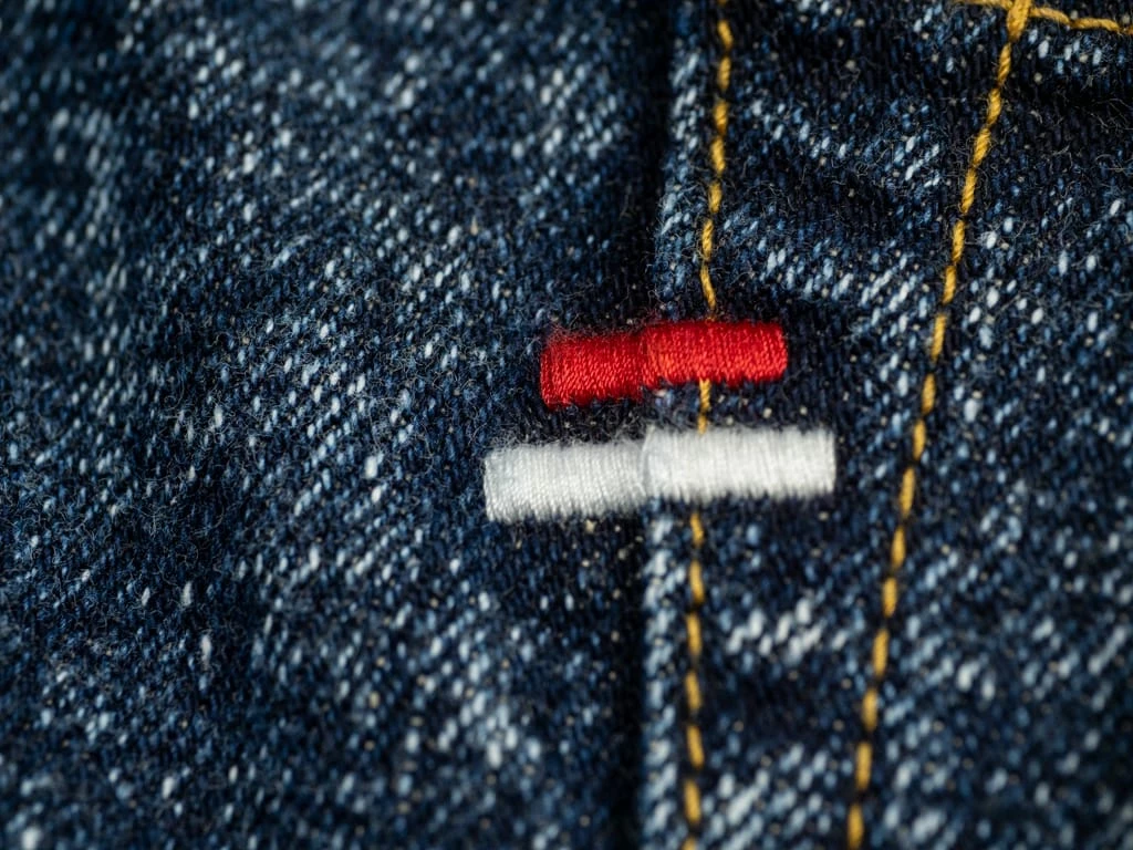 Near the back pocket, there is the embroidered Tanuki 二 (Ni) logo, two parallel lines in Japanese Kanji representing the number 2. The lower line represents the past, tradition, the standard, peace. The upper line represents the future, change, strength. The red and blue colours of their logo refer to Japan’s flag, honouring their roots as denim artisans.