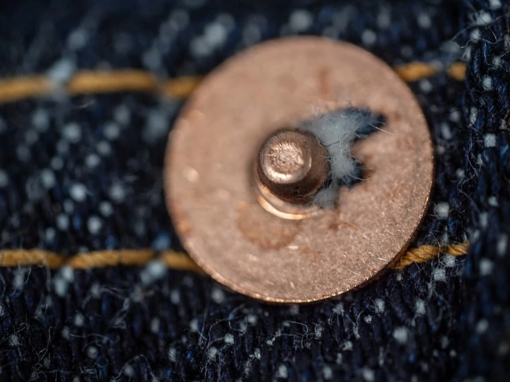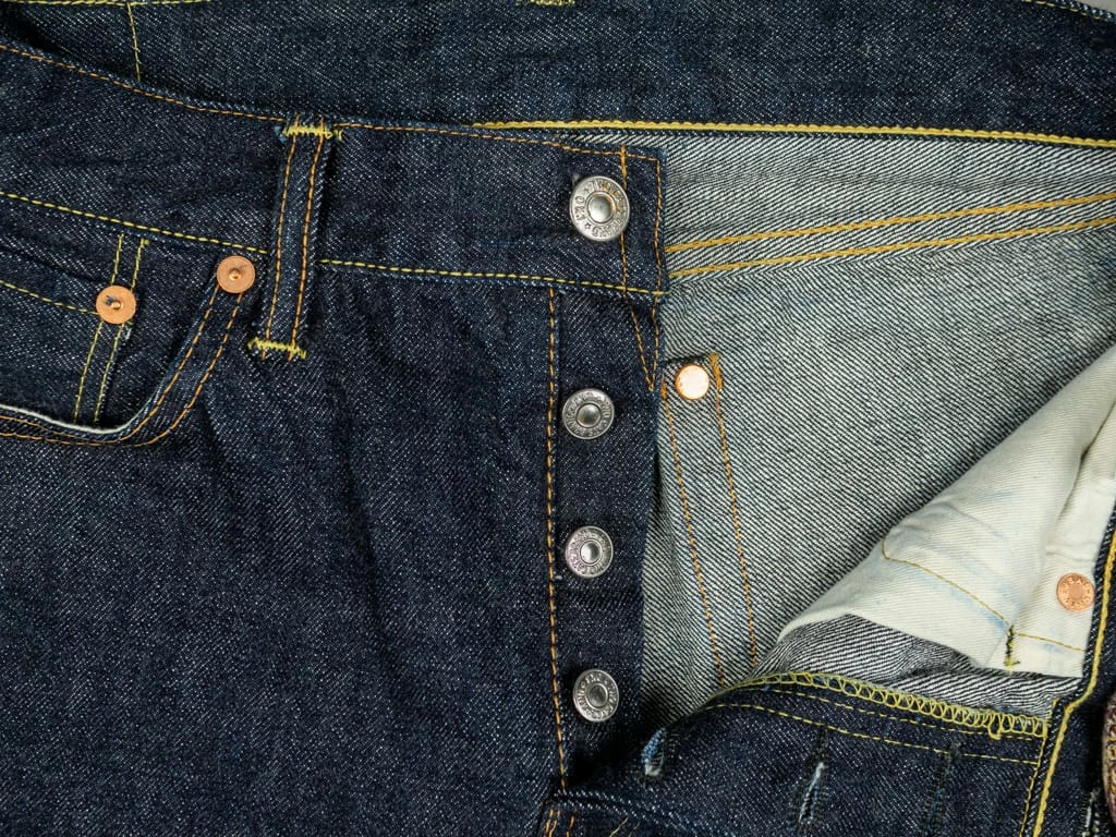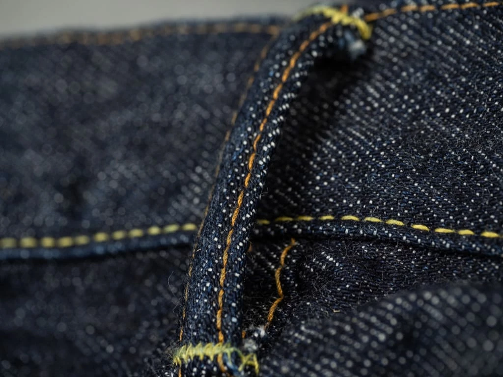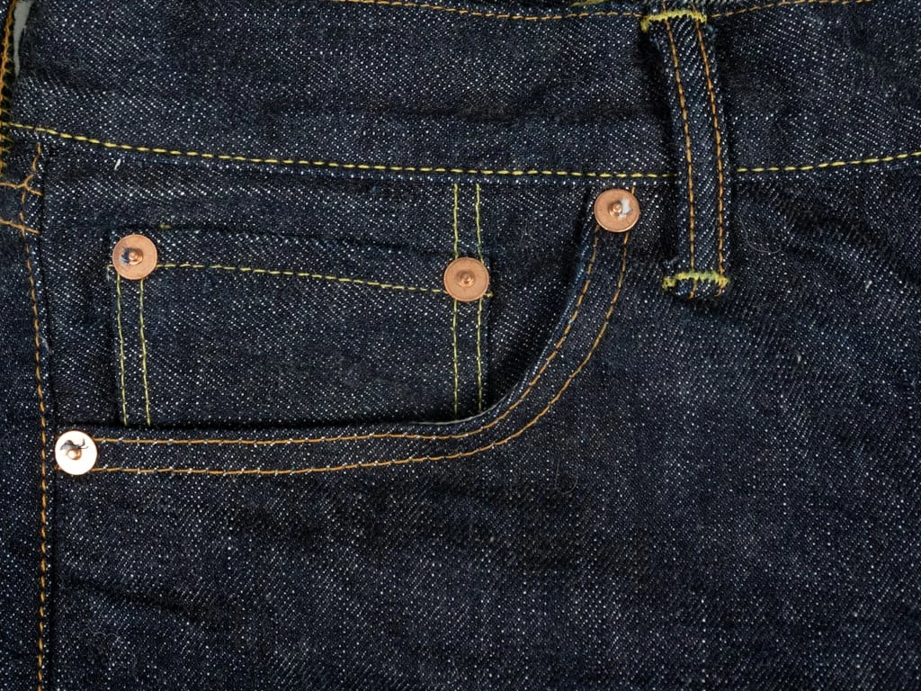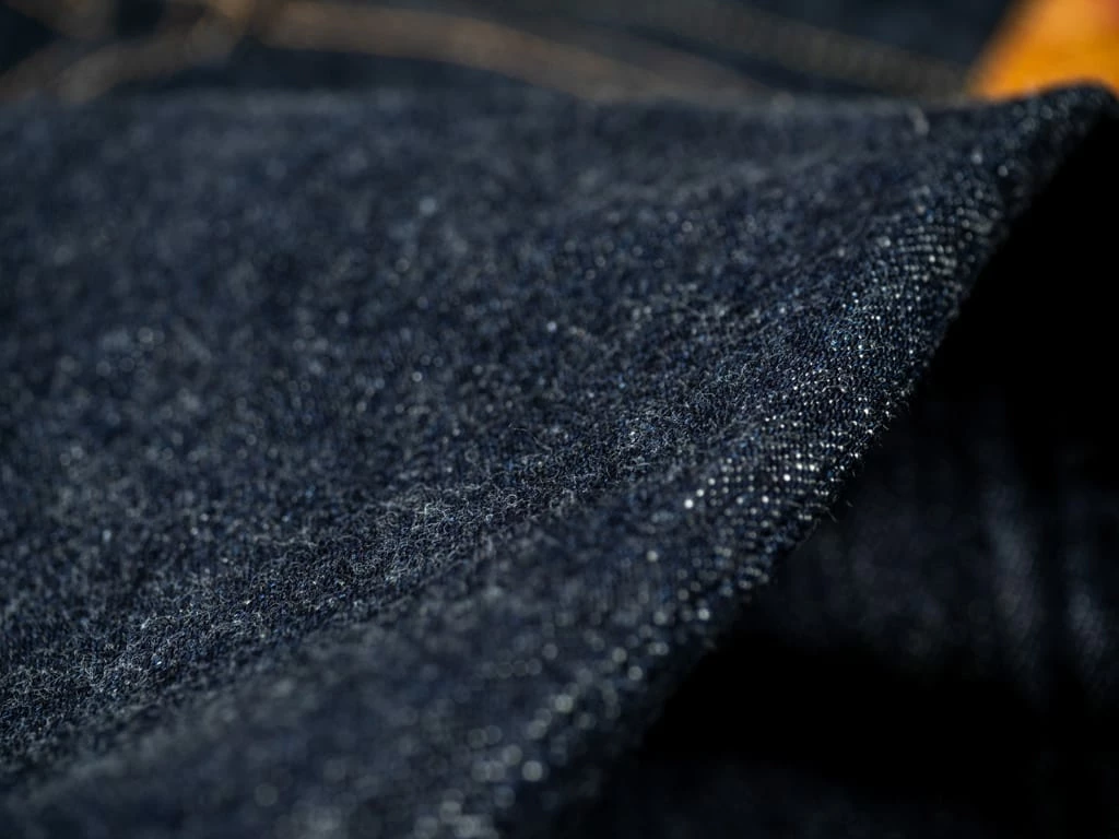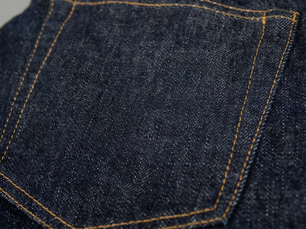 The fabric is a proprietary TCB unsanforized 13.5oz denim made of 100% Zimbabwe cotton. It has a slubby and irregular texture and the natural unevenness such as unstable thread thickness and irregular tense on the fabric made by a vintage loom, not by the mainstream methods of computer regulation.