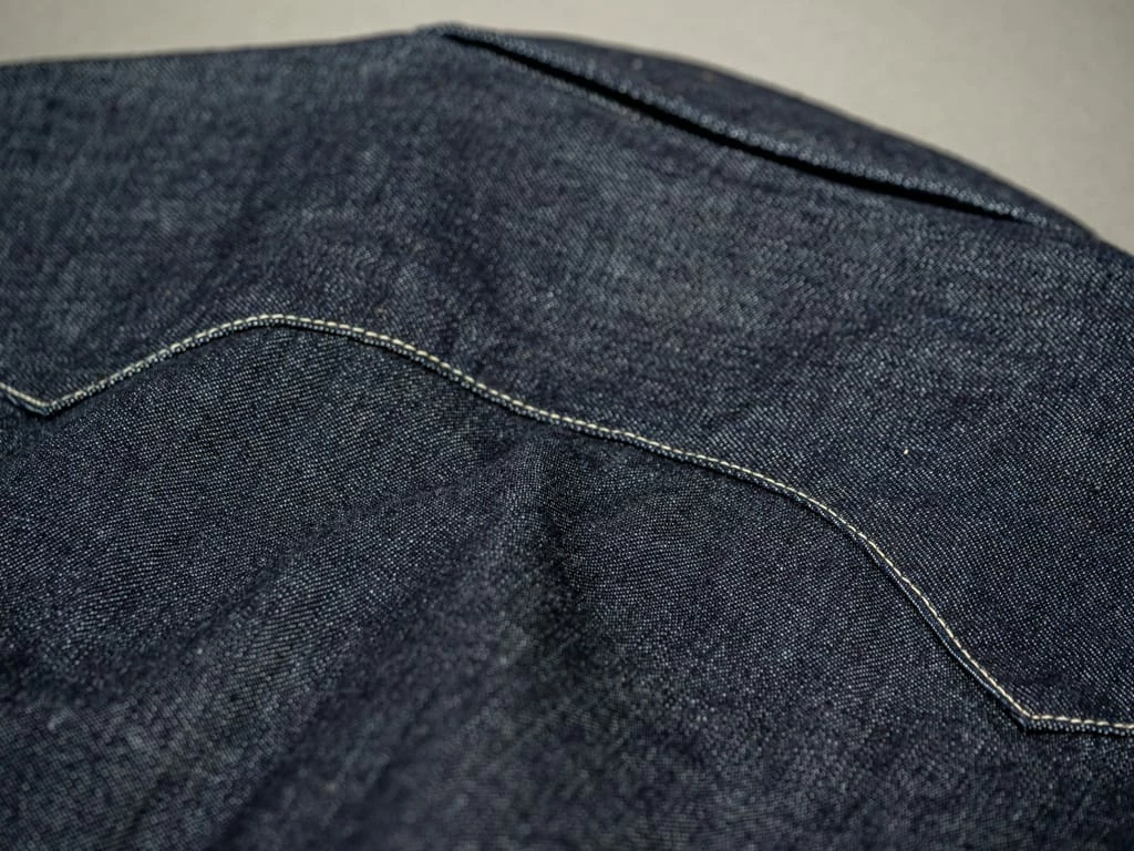 The same fabric as the TCB Ranchman shirt. An 8.5oz indigo denim with some irregularity on the surface. The cotton used for the denim fabric is grown in California. The denim is woven by vintage looms very slowly for the natural unevenness.