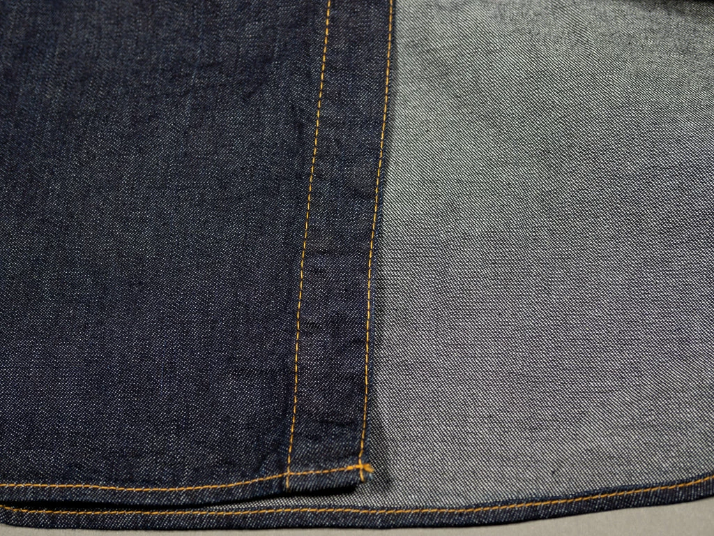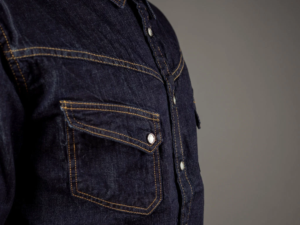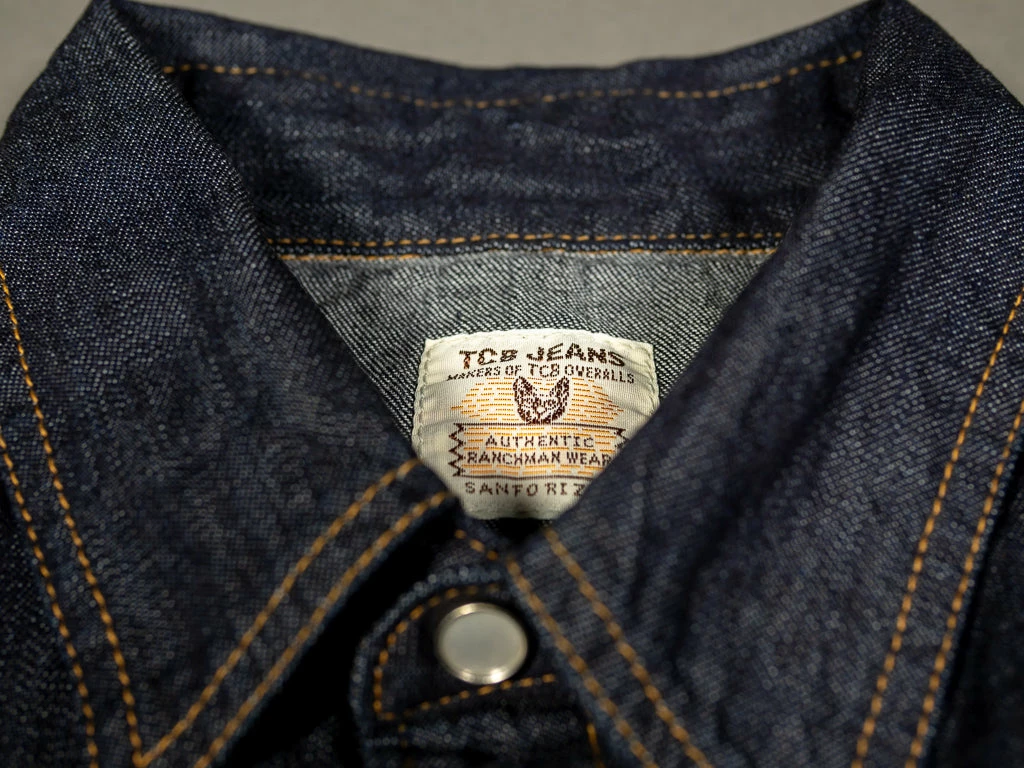 The TCB Ranchman shirt is a reproduction of the classic American western denim shirts of the 1940s. Carefully reproduced to be as close to the original as possible but with a slightly updated fit for a more contemporary look and comfortable wear. It is made with a raw 8.5oz sanforized natural Mura denim fabric. From the fabric to sewing to silhouette, it is made with care down to the last detail. It has two western pockets in the chest, both with snap buttons made of white shellfish.