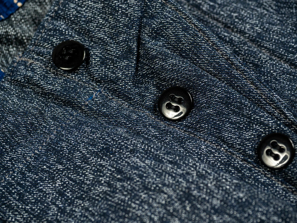 - Indigo discharge-dyed Japanese-milled 5 oz. chambray Wabash waistband, back pocket bags, and fly piping