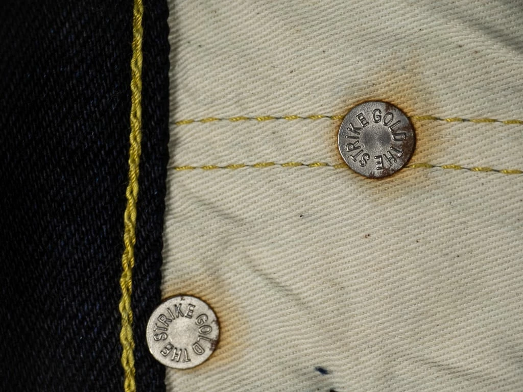 The fabric is rough hand helps set creases and starts to fade almost immediately by nature of its abrasive weave, and thanks to the spectacular fade, the denim acquires over the years, The Strike Gold jeans always achieve a unique character.