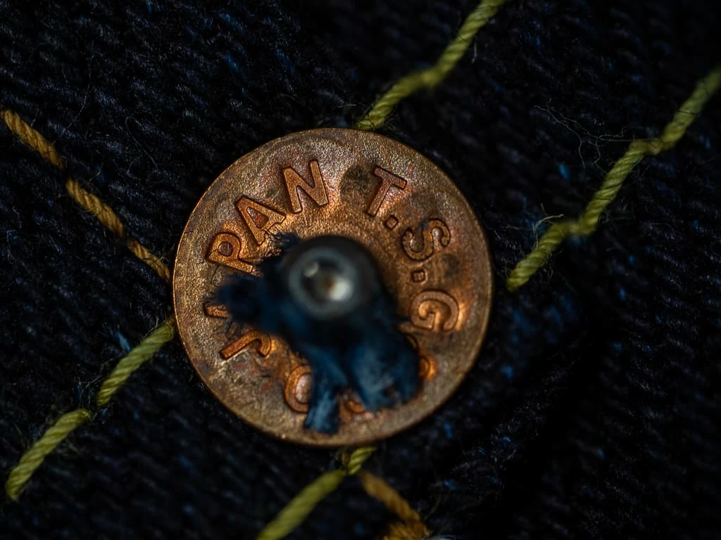 This model is full of details such as its hidden rivets in the back pockets, a deer leather patch and custom iron male rivets and copper female rivets. The male rivets will begin to oxidize over time, but the female ones will darken, providing an ageing aspect.