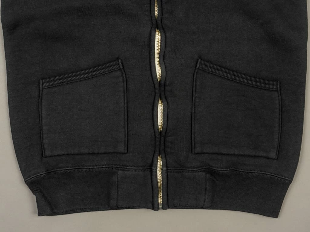 This Strike Gold Loopwheeled (“Tsuri-Ami”) hoodie is woven in the Japanese Kanekichi Wakayama workshop, one of only two workshops in the world still keeping in operation after more than 100 years the tubular textile production machines that allow seamless garments to be made. The only tension used in the knitting process is gravity, the end result being a knitted fabric with virtually no inbuilt stress or tension. A loopwheel machine rotates at just 24 revolutions per minute, with only 8-10 garments worth of fabric produced per day. A modern knitting machine in excess of 10 times that. The result is a heavyweight, soft but strong fabric, and the best sweatshirt material made today.