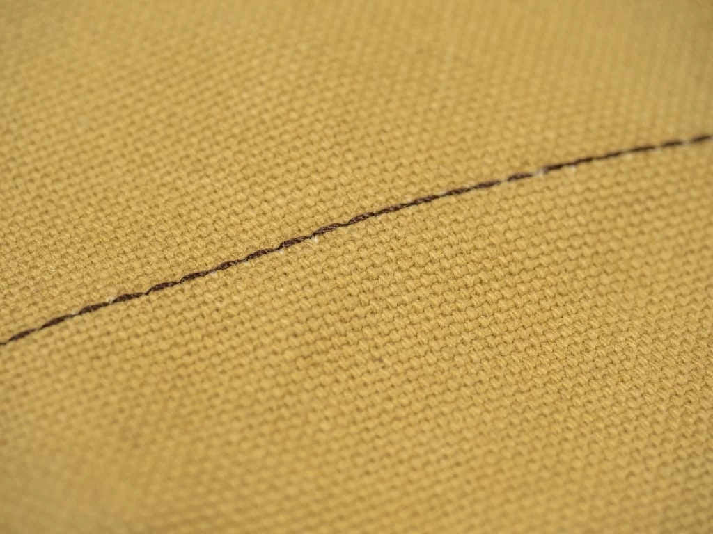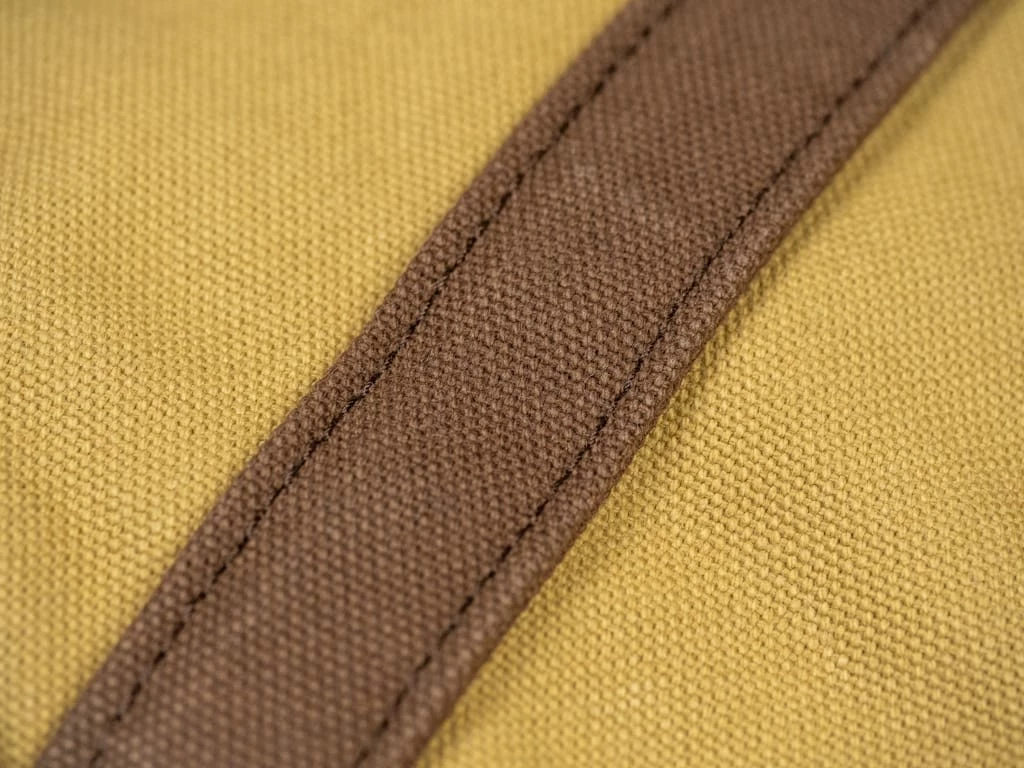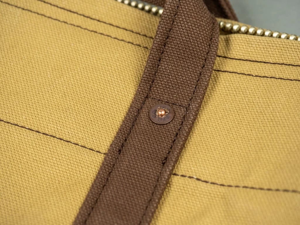 A brass ring and Naskan were used for the rugged fasteners, rivets, and metal fittings. The paraffin-processed No. 8 canvas has a chewy fabric and is water repellent in a little rain.